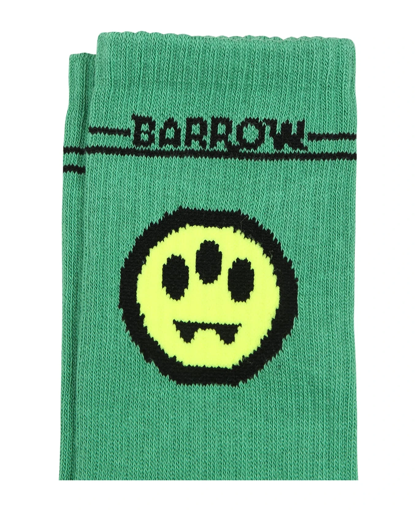 Green socks, made from terry cloth, with ribbed leggings; they are emebellished with yellow iconic smile and black logo