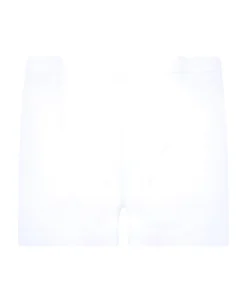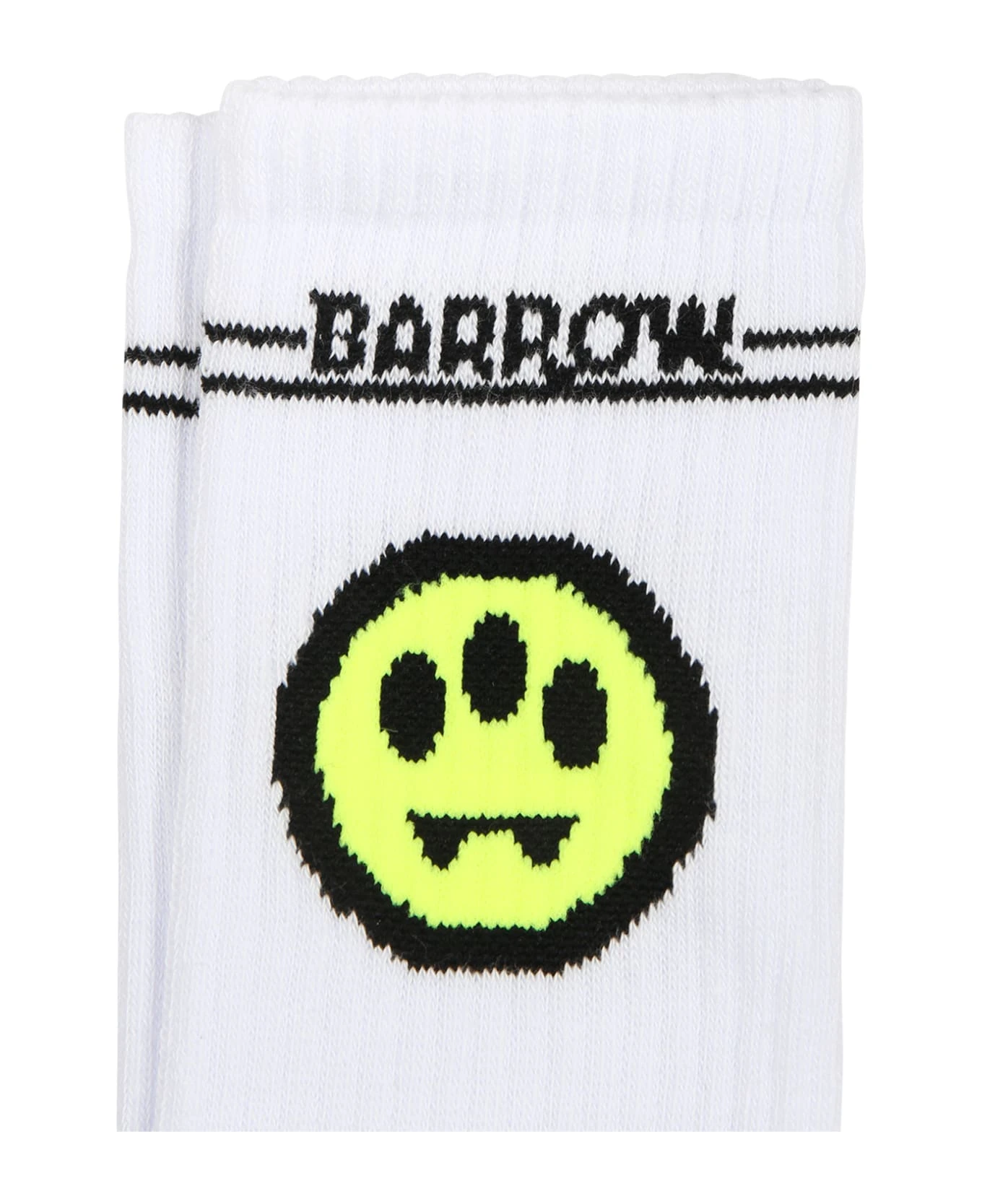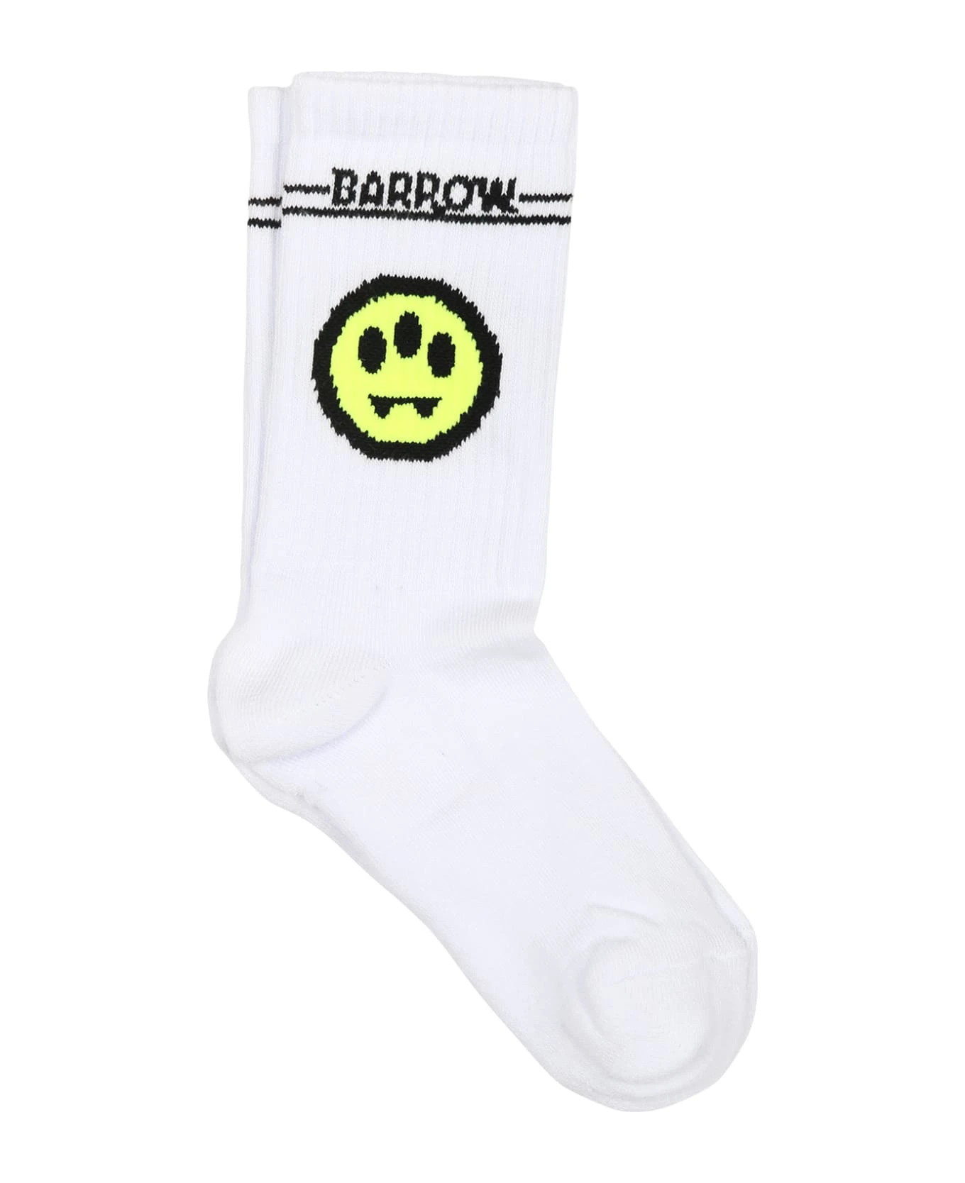 White socks, made from terry cloth, with ribbed leggings; they are emebellished with yellow iconic smile and black logo