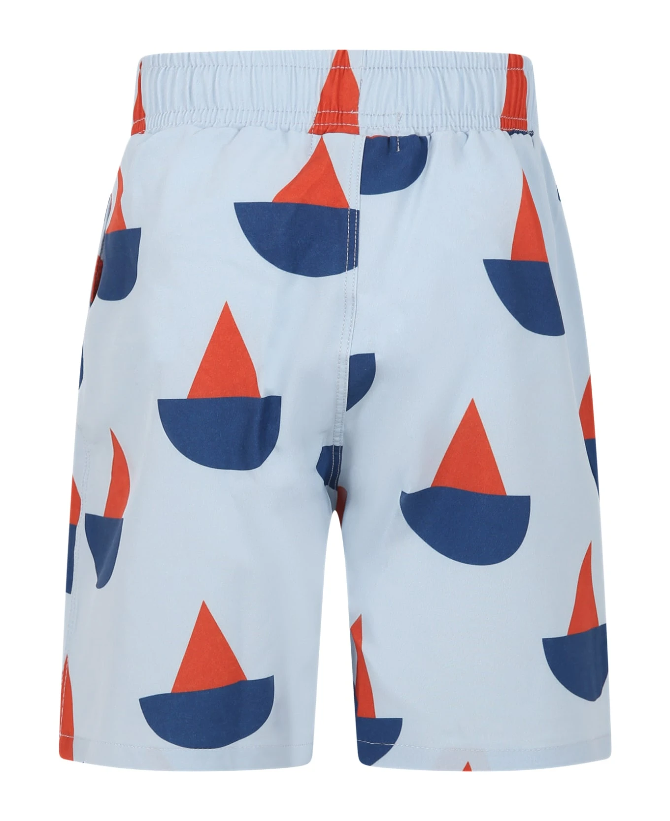 Light blue swim boxer in polyester, elastic waistband and drawstring, side pockets. It is embellished with printed boats all-over.