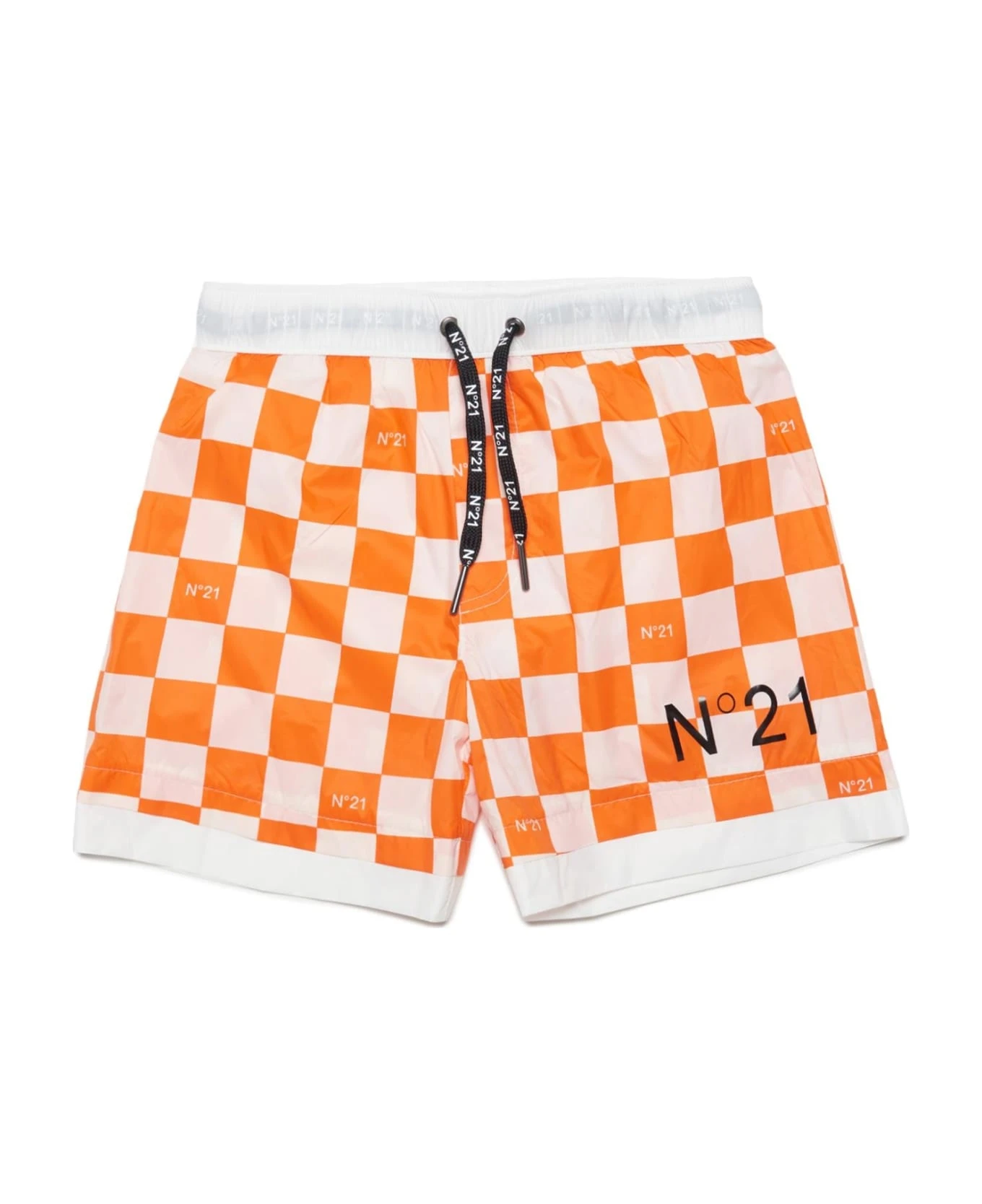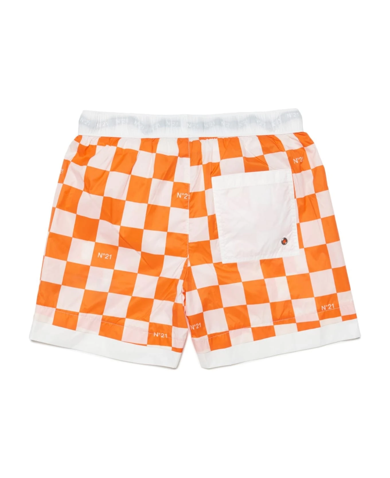 checked logo-print swim shorts from Nº21 Kids featuring orange, white, bold check pattern, logo print to the side, elasticated drawstring waistband and rear patch pocket. Be mindful to try on swimwear over your own garments..