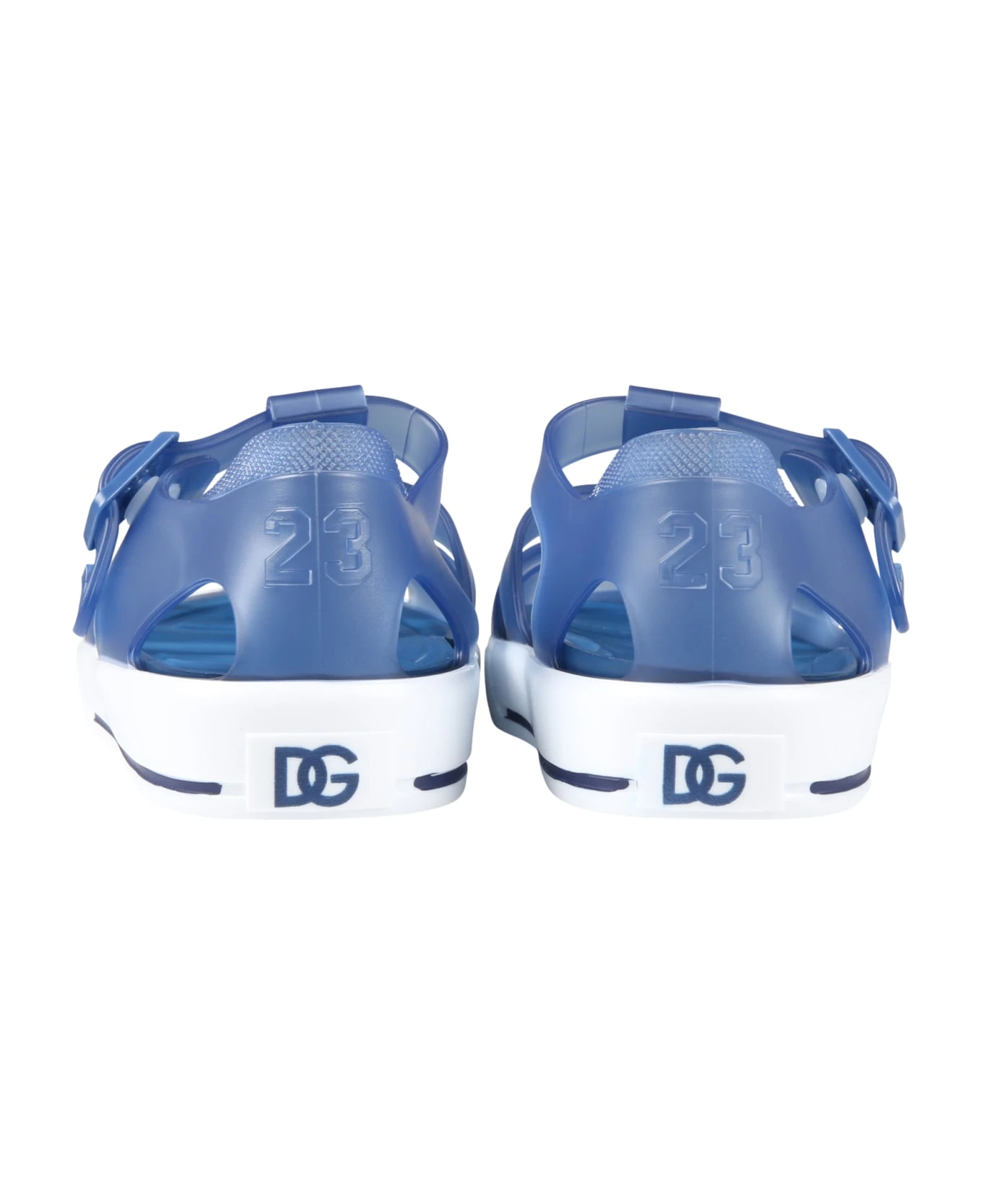 Blue sandals, with white sole, press-stud closure on the side and removable insole. They are embellished with red embrossed logo, on the front.