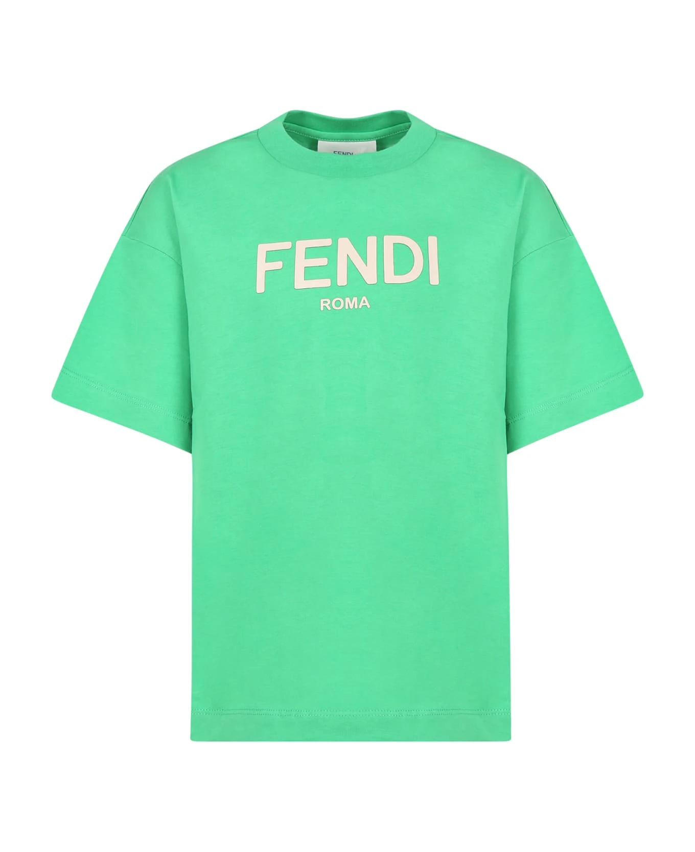 Green oversize t-shirt, made from cotton jersey, with crewneck and short sleeves; it is embellished with beige rubbered logo on the front.