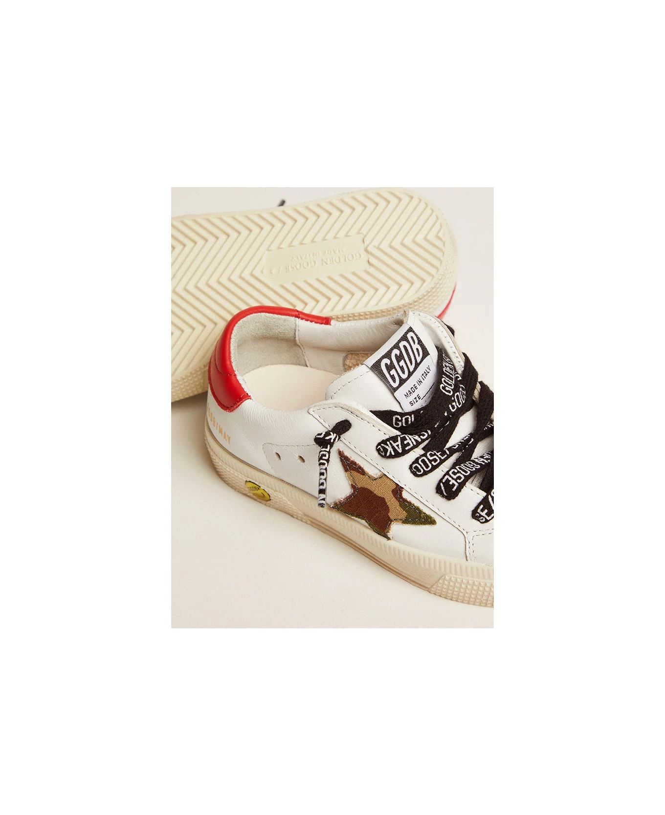 Low sneakers, laces with lettering, camouflage star and red back. Rubber sole. Leather.