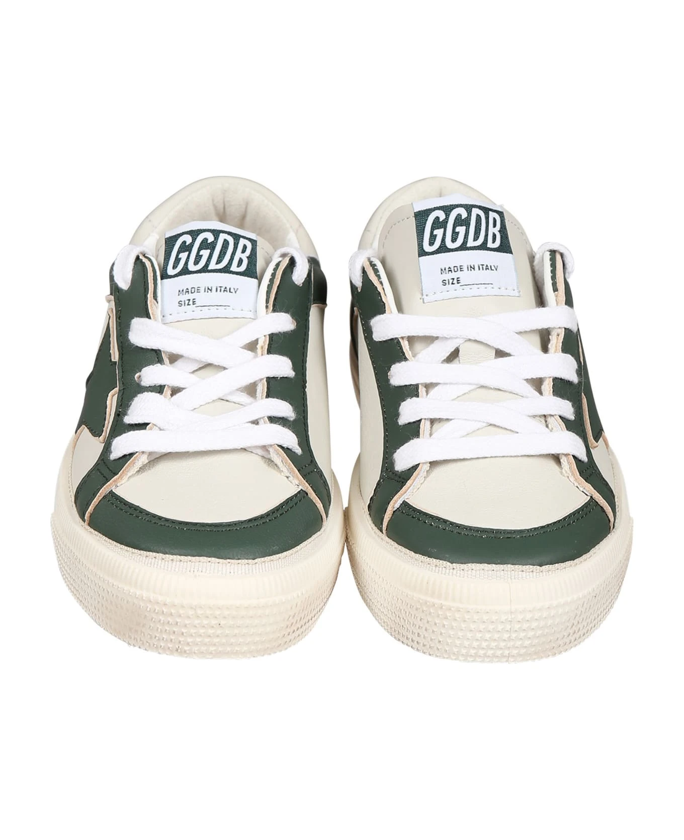 Ivory leather sneakers, with rubber sole with dirty effect, round toe, lace-up closure. They are embellished with the iconic green star, green details and a yellow smiley logo on one side.