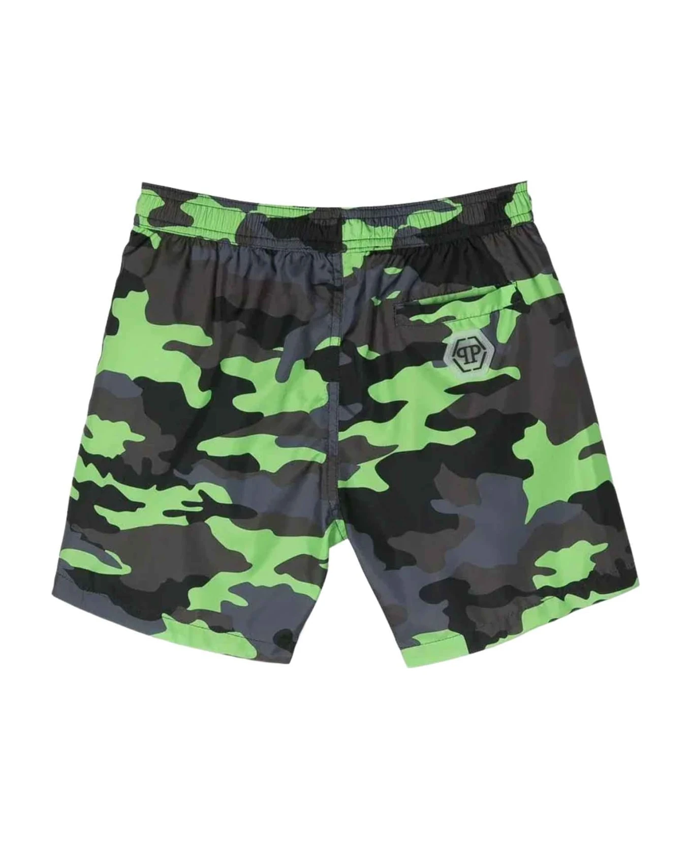 green swimsuit boy. Camouflage pattern, logo print on the front, back application with logo and elasticated drawstring waist. 100% polyester