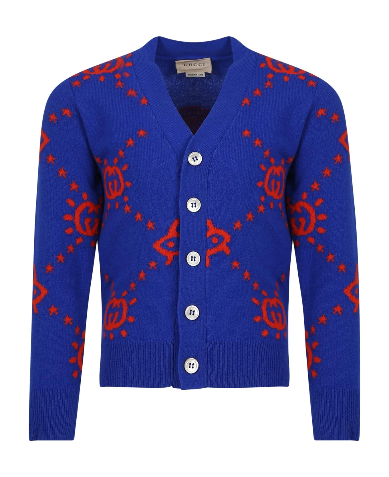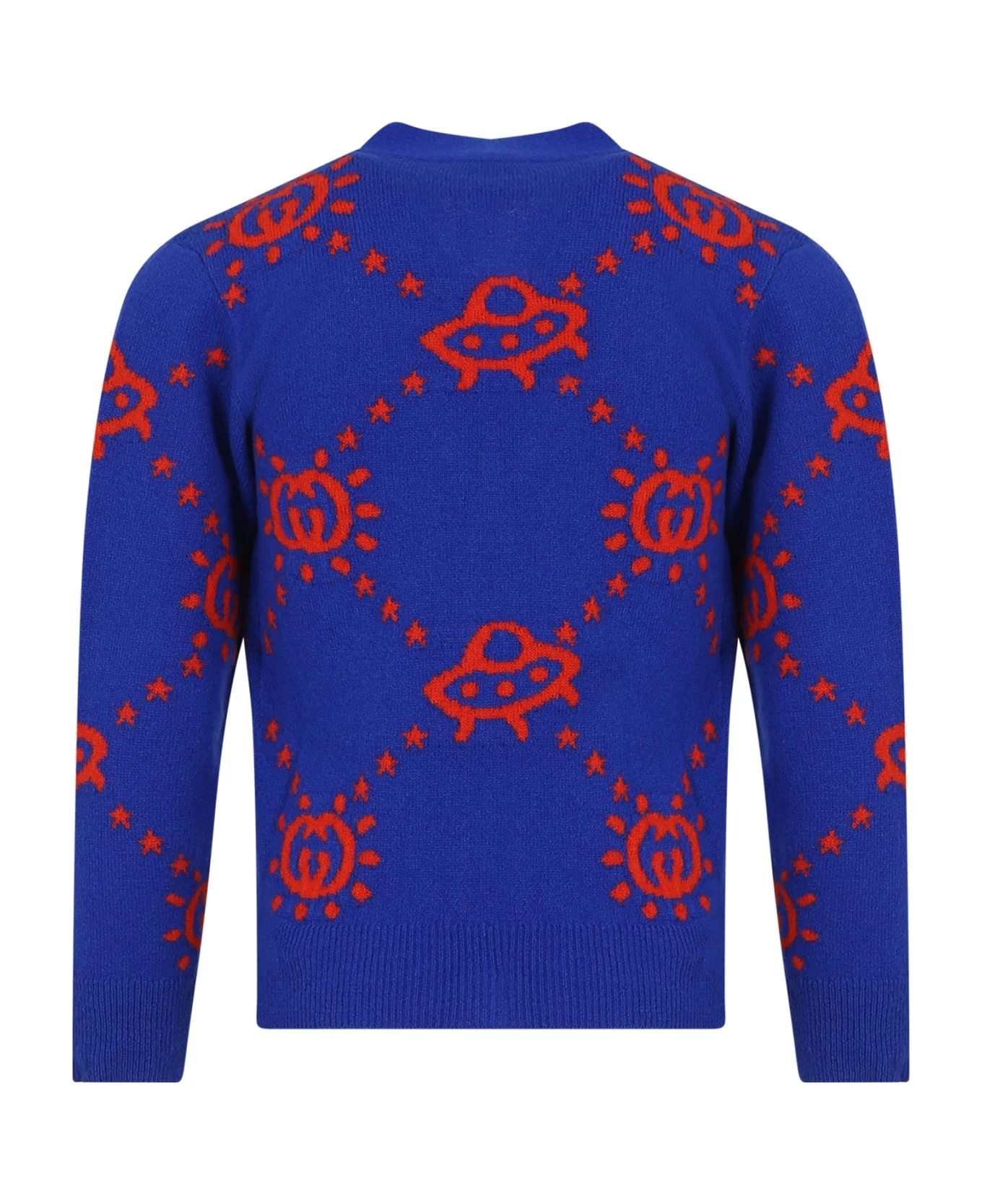 Blue wool cardigan, long sleeves, with crew neck. It is embellished with a contrasting red all-over GG and UFO cross inlay.