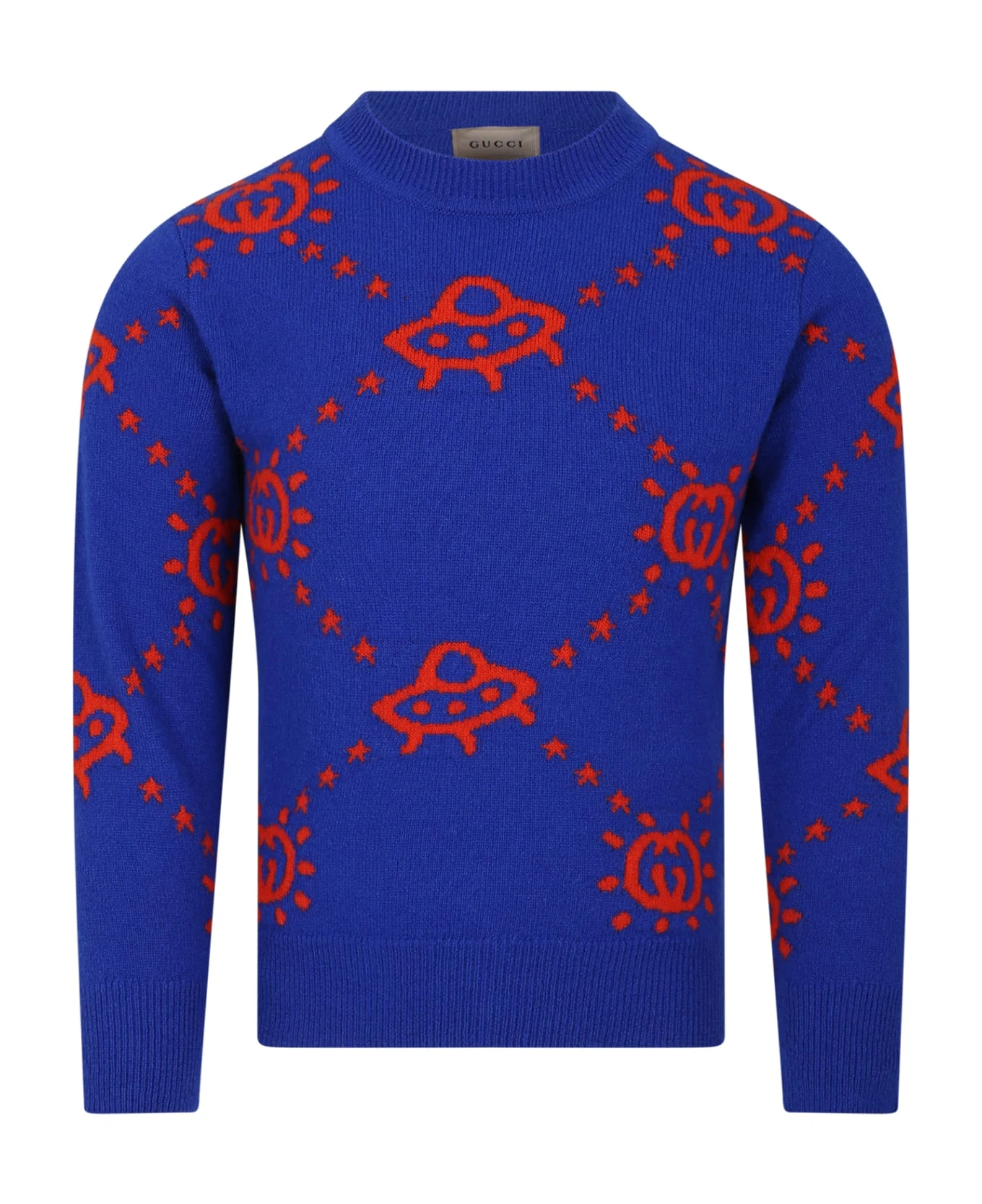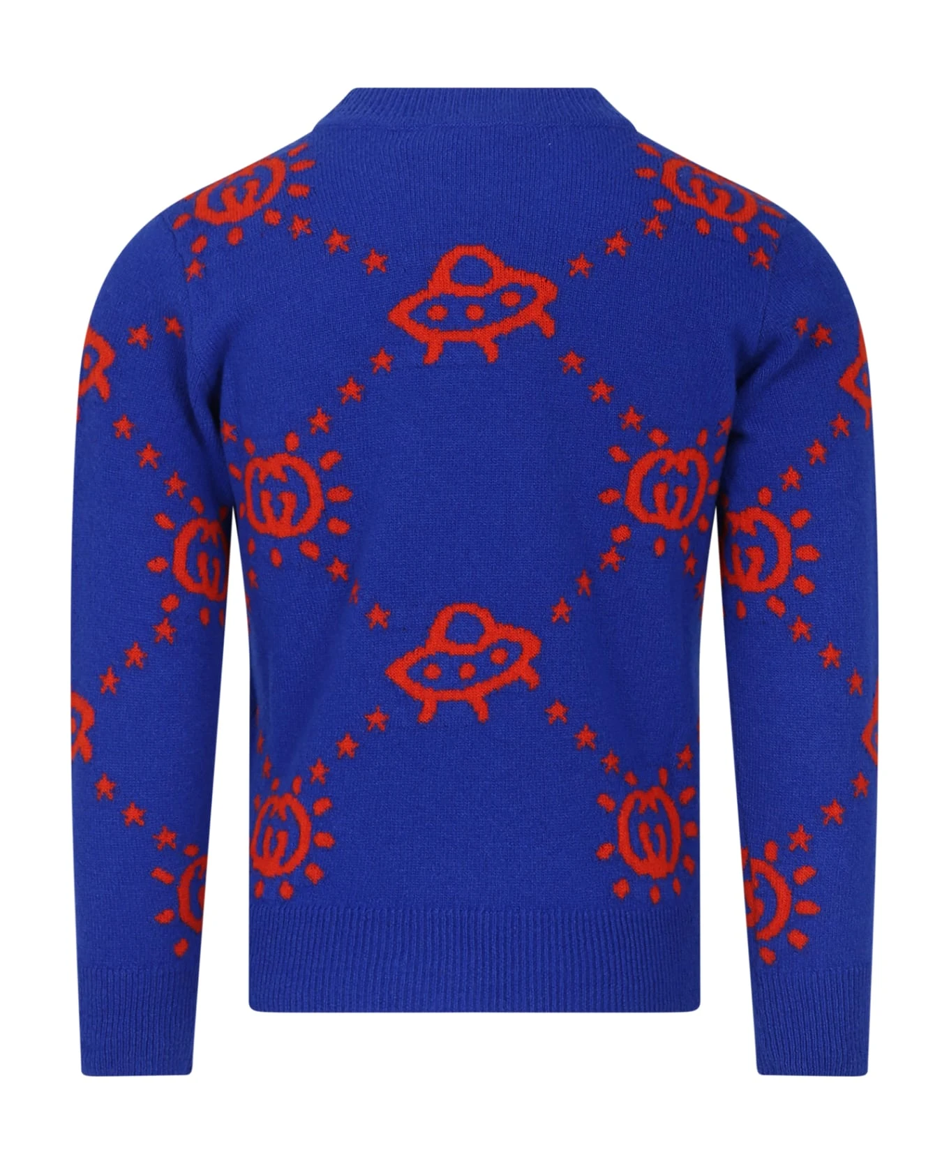 Royal blue sweater with crew-neck and long sleeves and buttoned; it is embellished with all-over interlocking GG and Ufo intarsia in a contrasting red.
