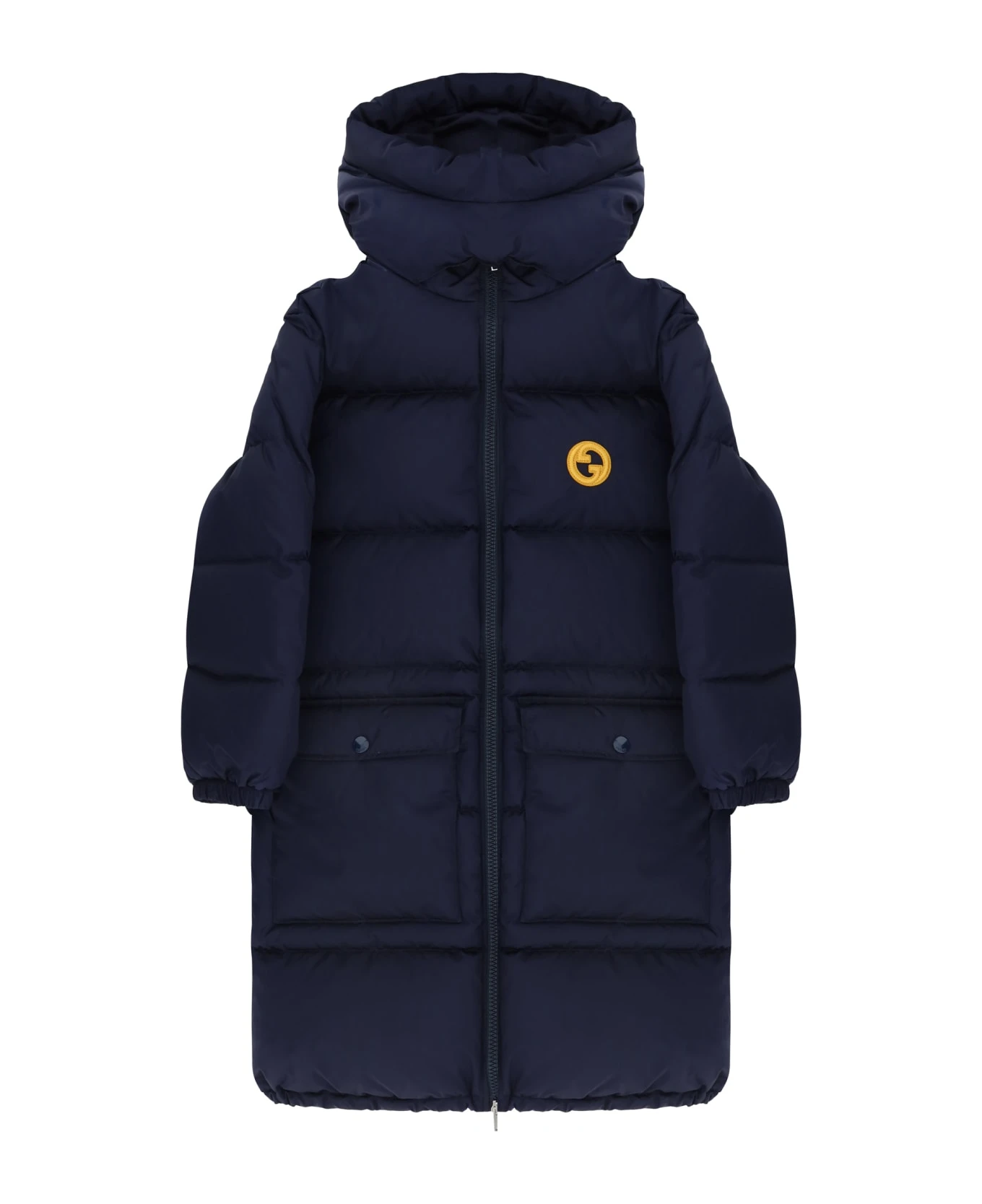 Down jacket for boy by gucci, double-slider front zipper closure, hooded design with high collar adjustable by velcro strap, two side welt pockets, all-over quilted and padded design, elastic cuffs, regular fit, patch with iconic brand monogram applied on front, multicolored melting gucci graphic embroidered in contrasting color on back.