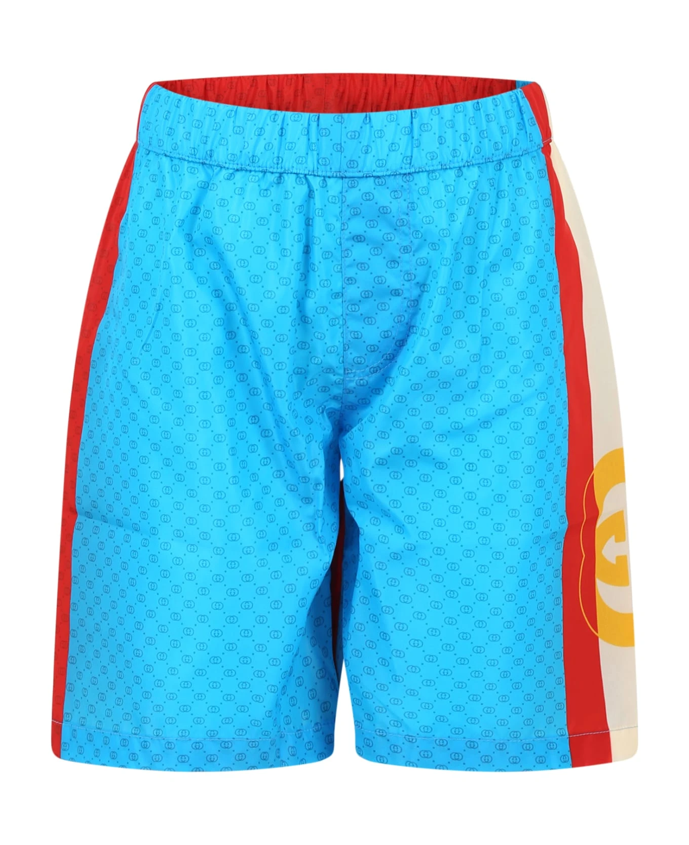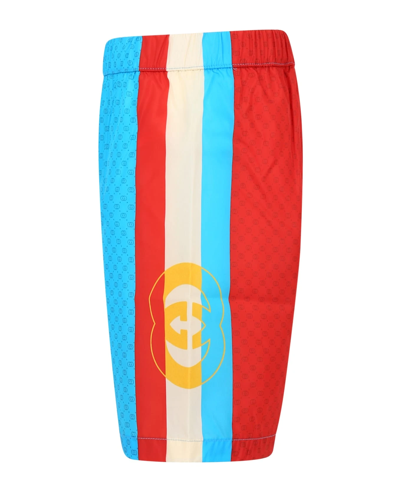 Multicolored beach shorts, with elastic waist. They are embellished with side logo and all-over GG logo.