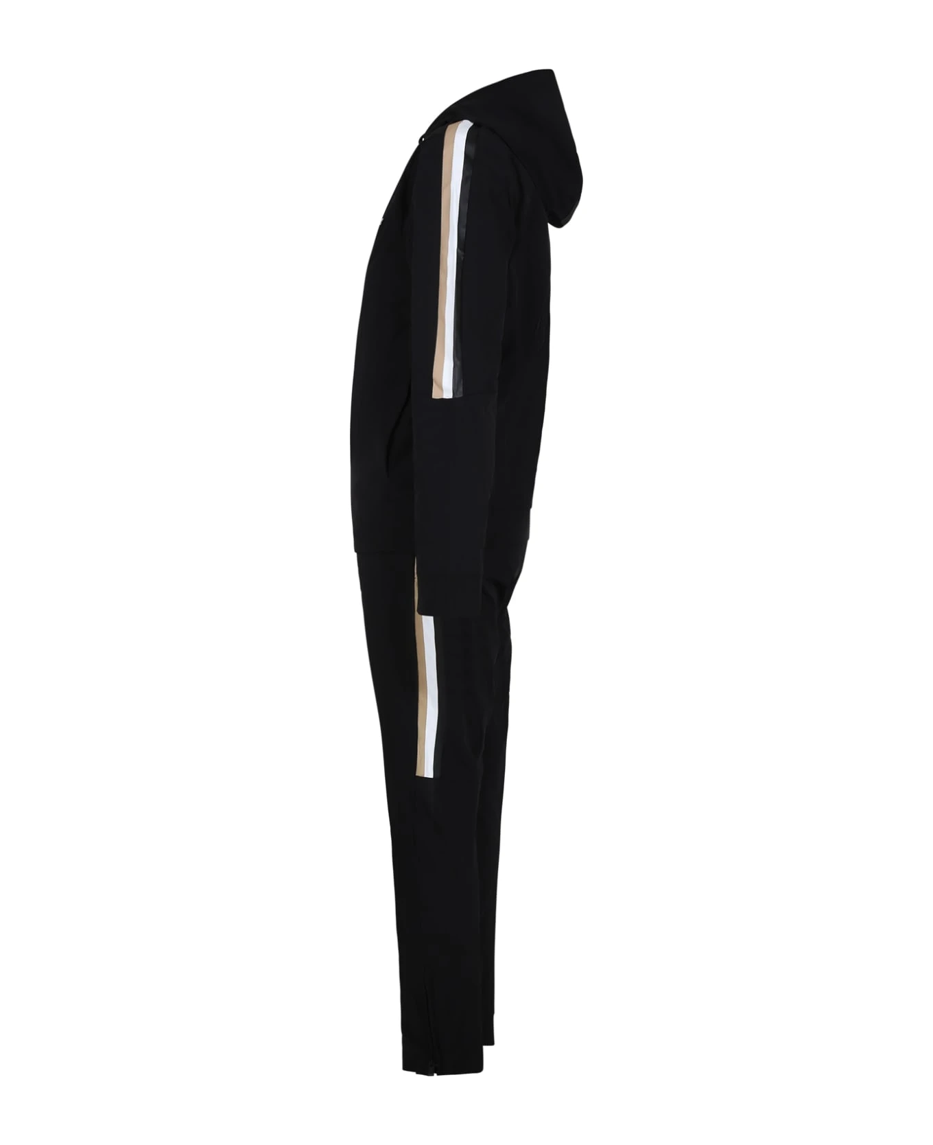 Black suit, composed of sweatshirt and trousers. Sweatshirt with long sleeves, hood, front zip closure, side pockets, ribbed cuffs and hem. It is embellished with brown and white stripes on the shoulders, with rubber logo on the chest. Trousers with elastic waist, side pockets. They are embellished with brown and white bands on the sides and a rubber logo on the leg.