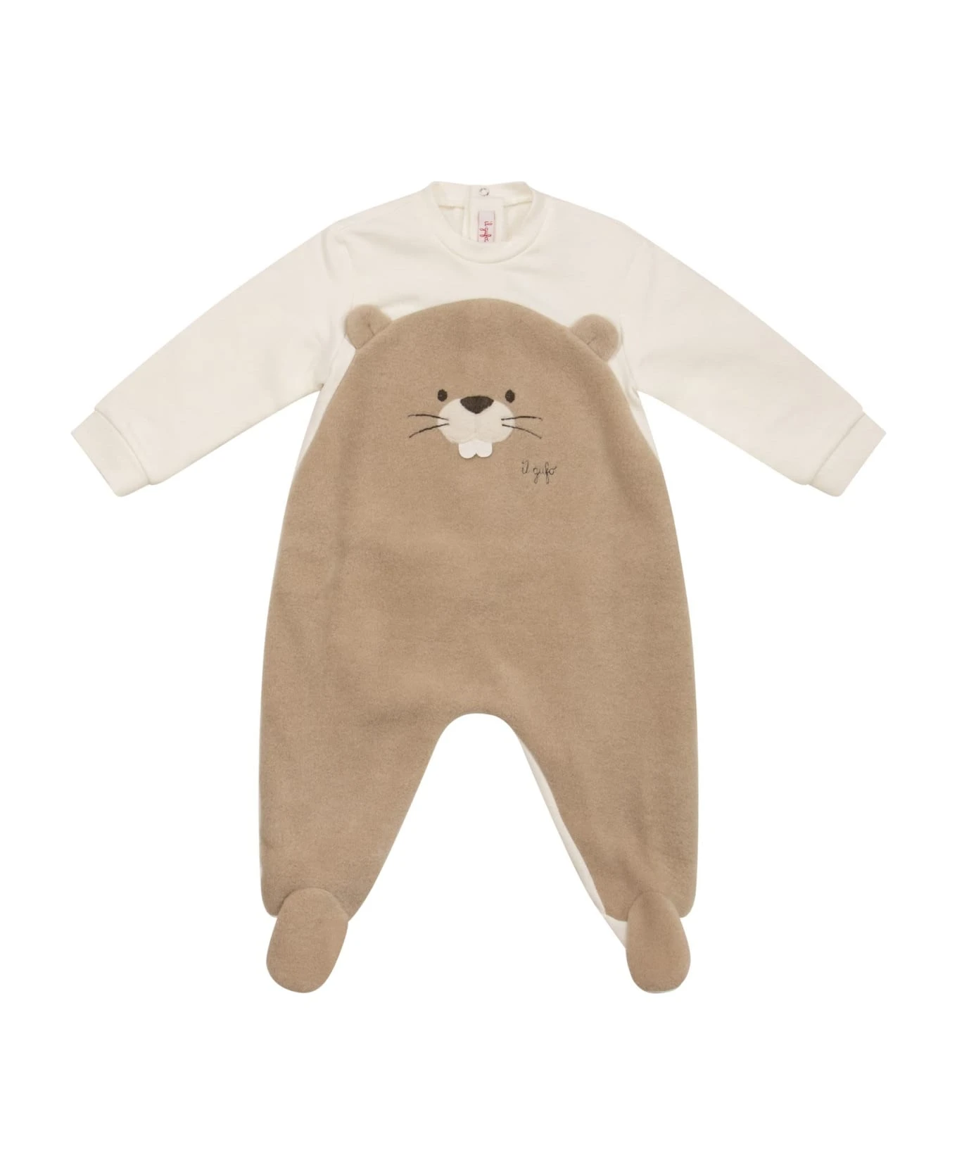 Stretch fleece baby footed sleepsuit with front insert of a funny beaver with embroidered snout in soft beige fleece. – Back opening with practical press studs – Contrasting embroidered Il Gufo logo DESIGNER ID: A23TP335M0100. 1012