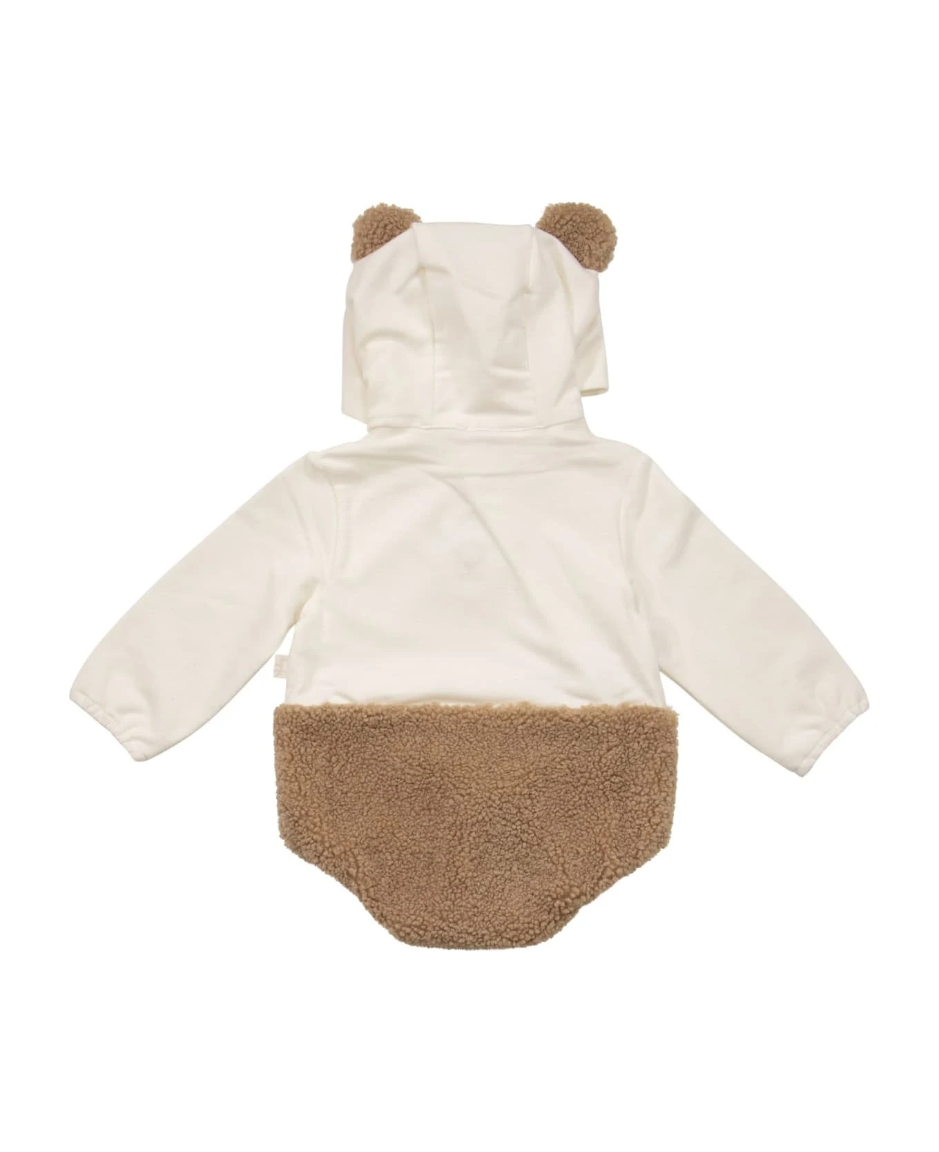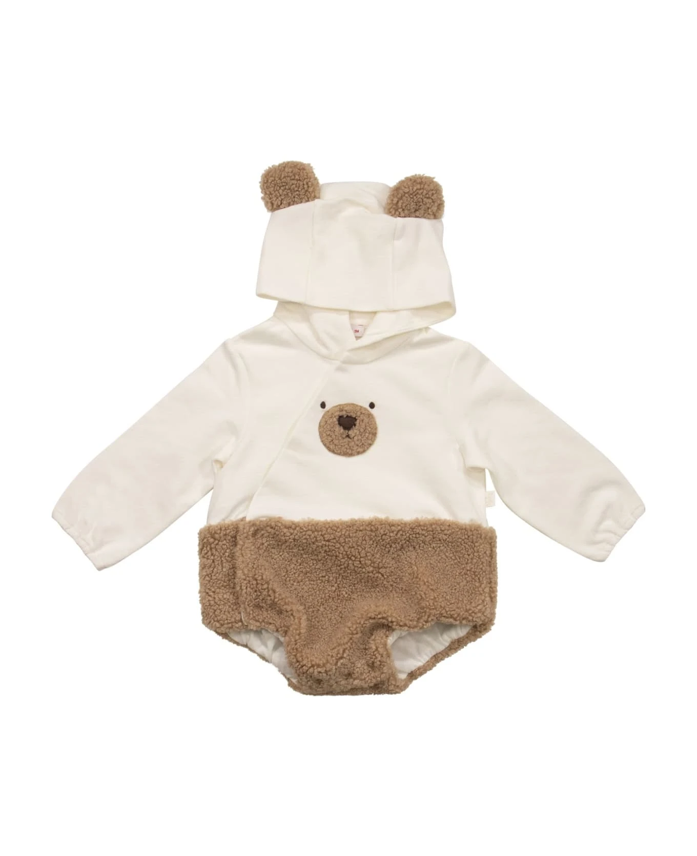 Stretch jersey sleepsuit with hood, wrap-around opening with press studs, teddy bear face and hazel-coloured curly details. – Elastic cuffs and hem with press stud fastening – Hood DESIGNER ID: A23DP408M0100. 1014