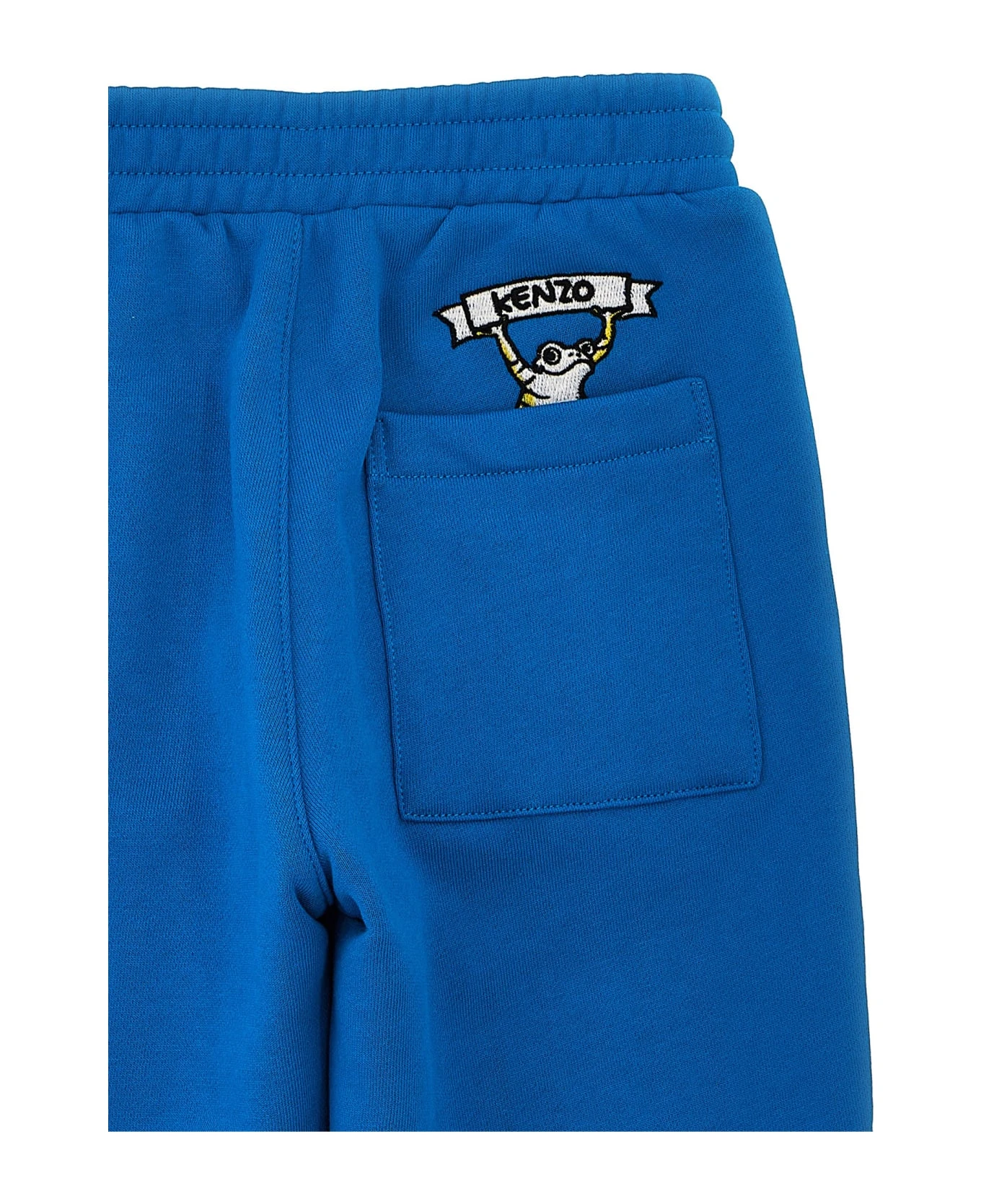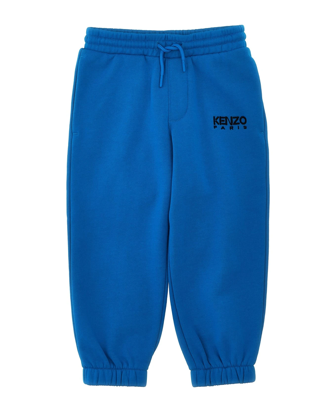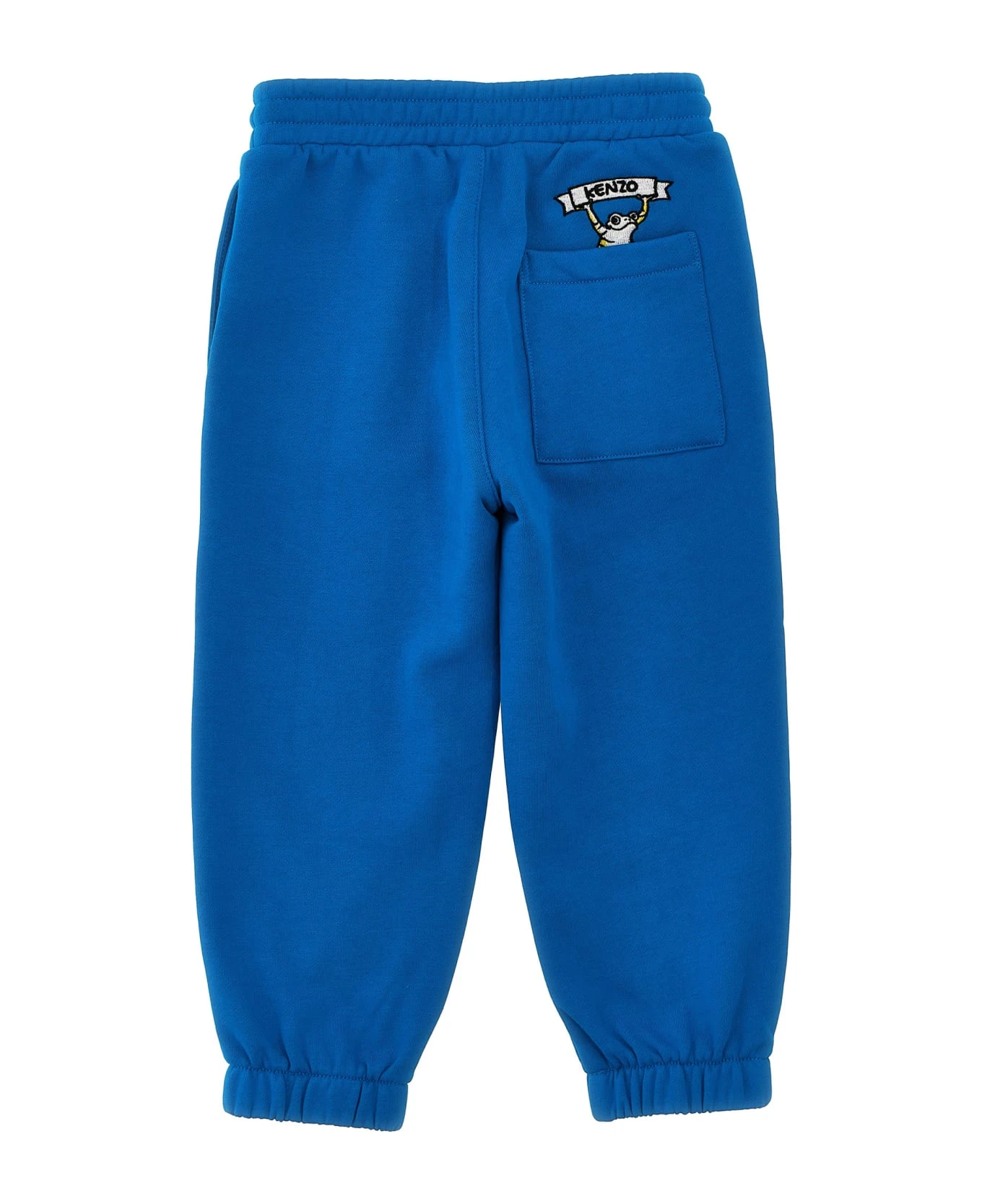 Cotton blend joggers with embroidery at the front and back, elastic and drawstring at the waist, pockets, and elastic ankle cuffs.