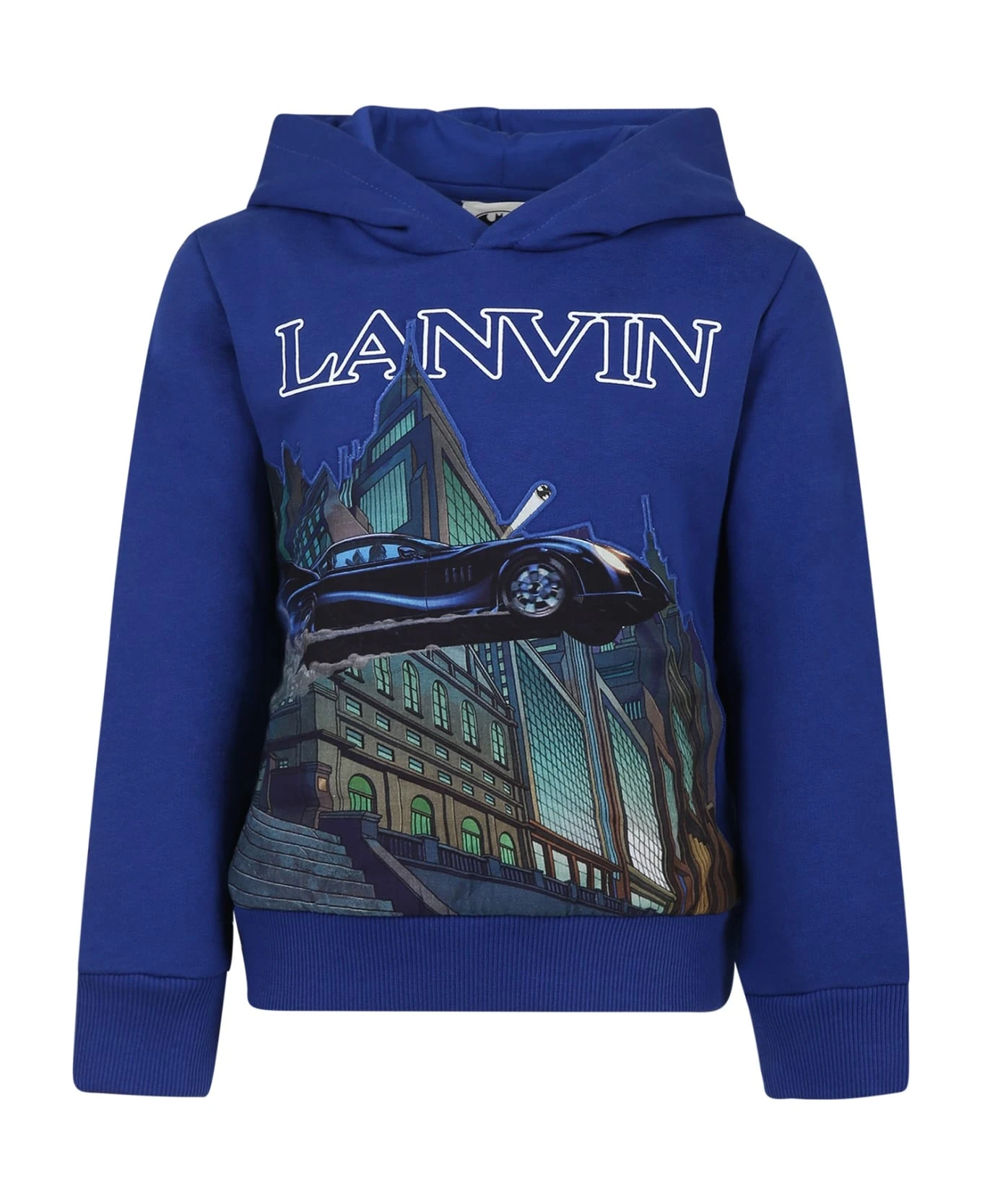 Blue sweatshirt in organic cotton fleece, long sleeves, with ribbed hood, cuffs and hem. It is embellished with batman print and logo on the front. It’s a DC collaboration for Lanvin.