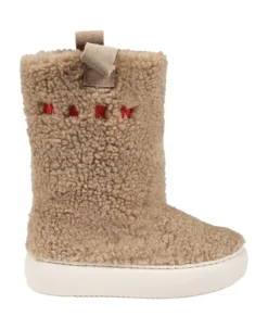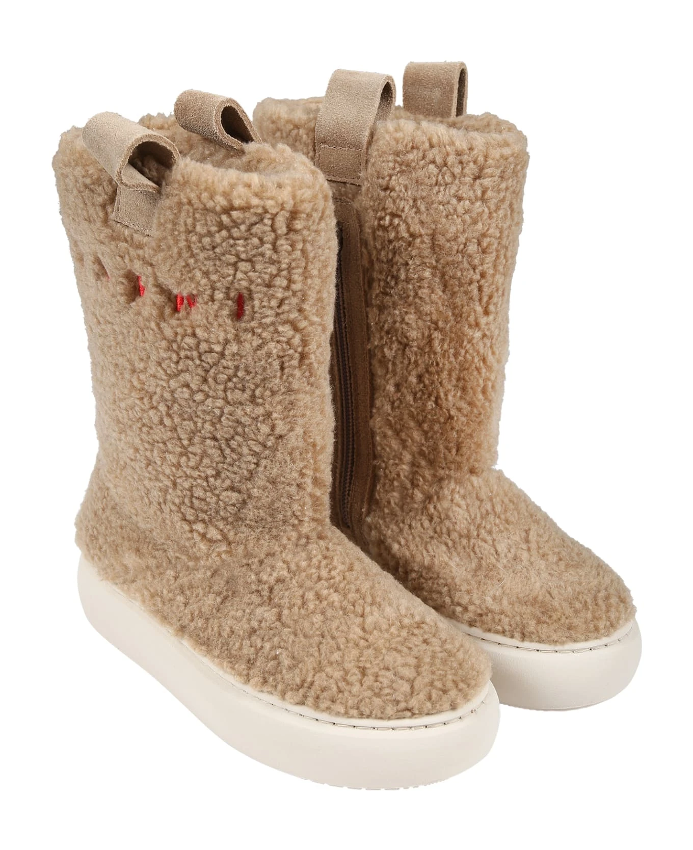 Beige shearling boots, with rubber sole, side zip closure and tabs on the sides. They are embellished with logo embroidered on the side.
