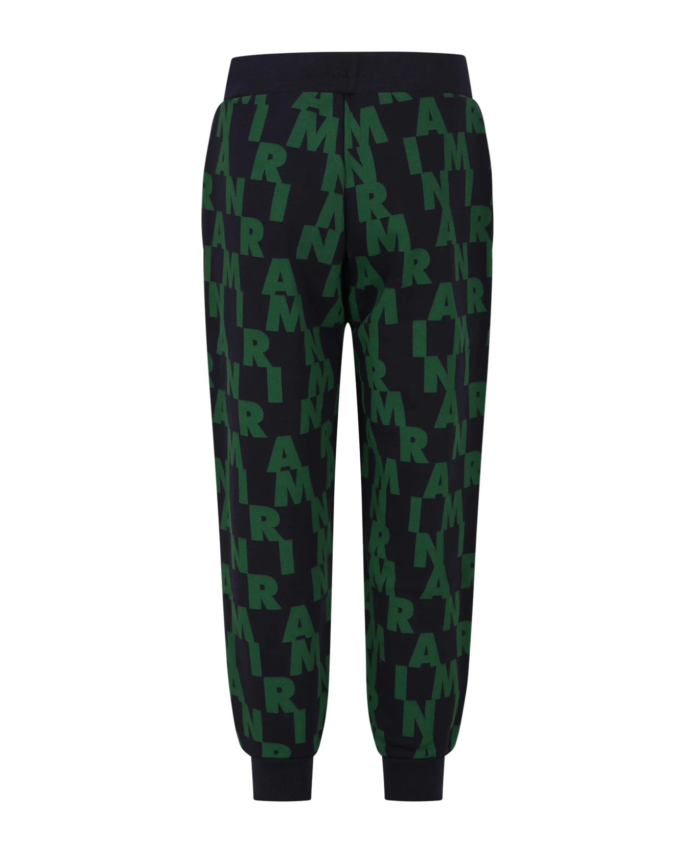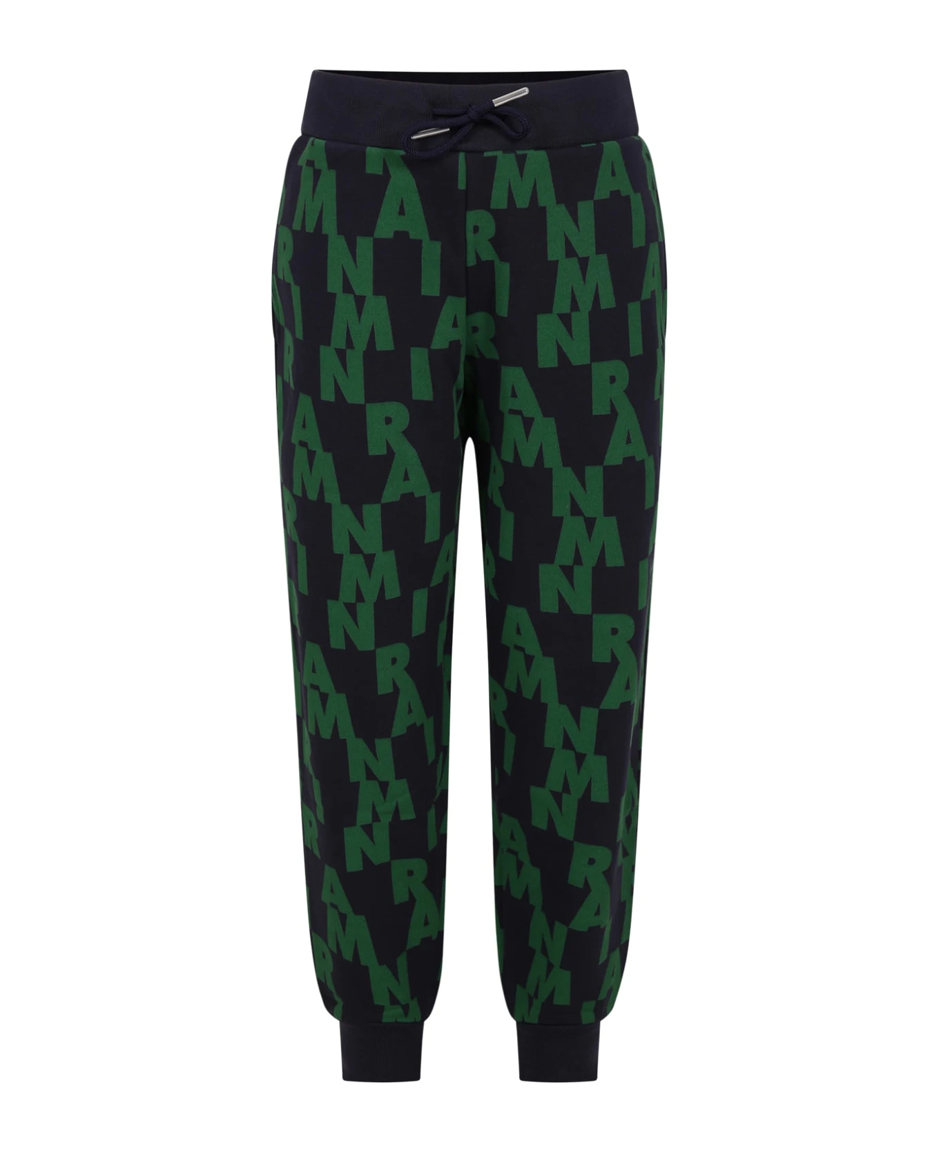 Blue tracksuit trousers in brushed cotton, elastic waistband. It is embellished with green “Marni” brand logo print all-over.