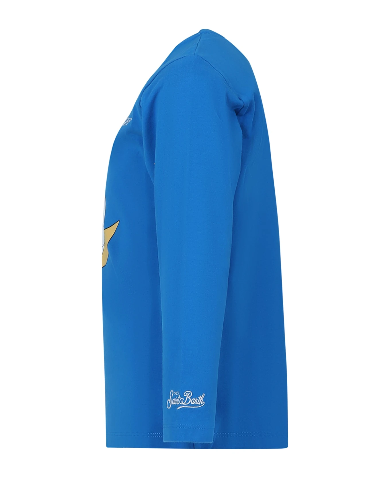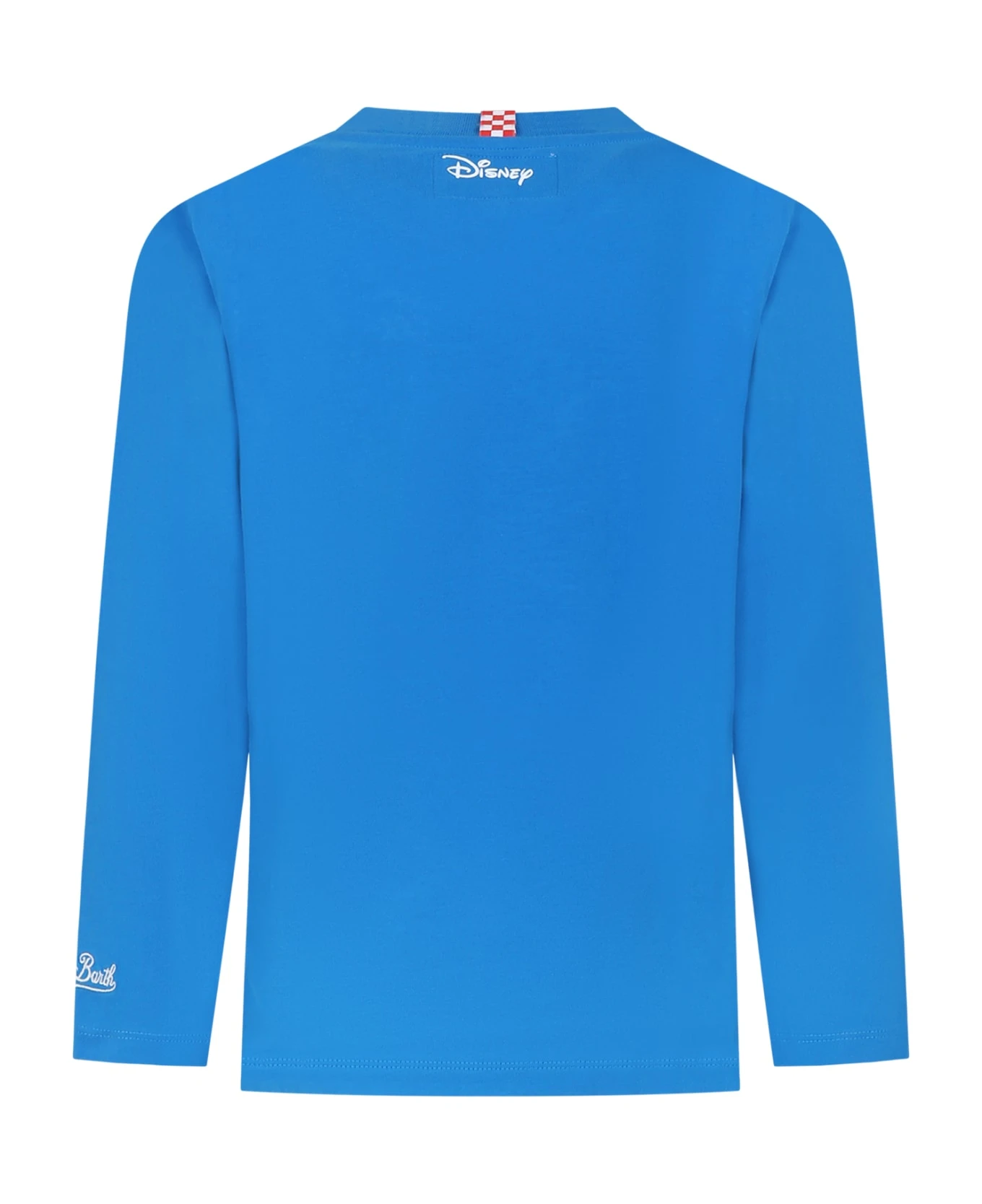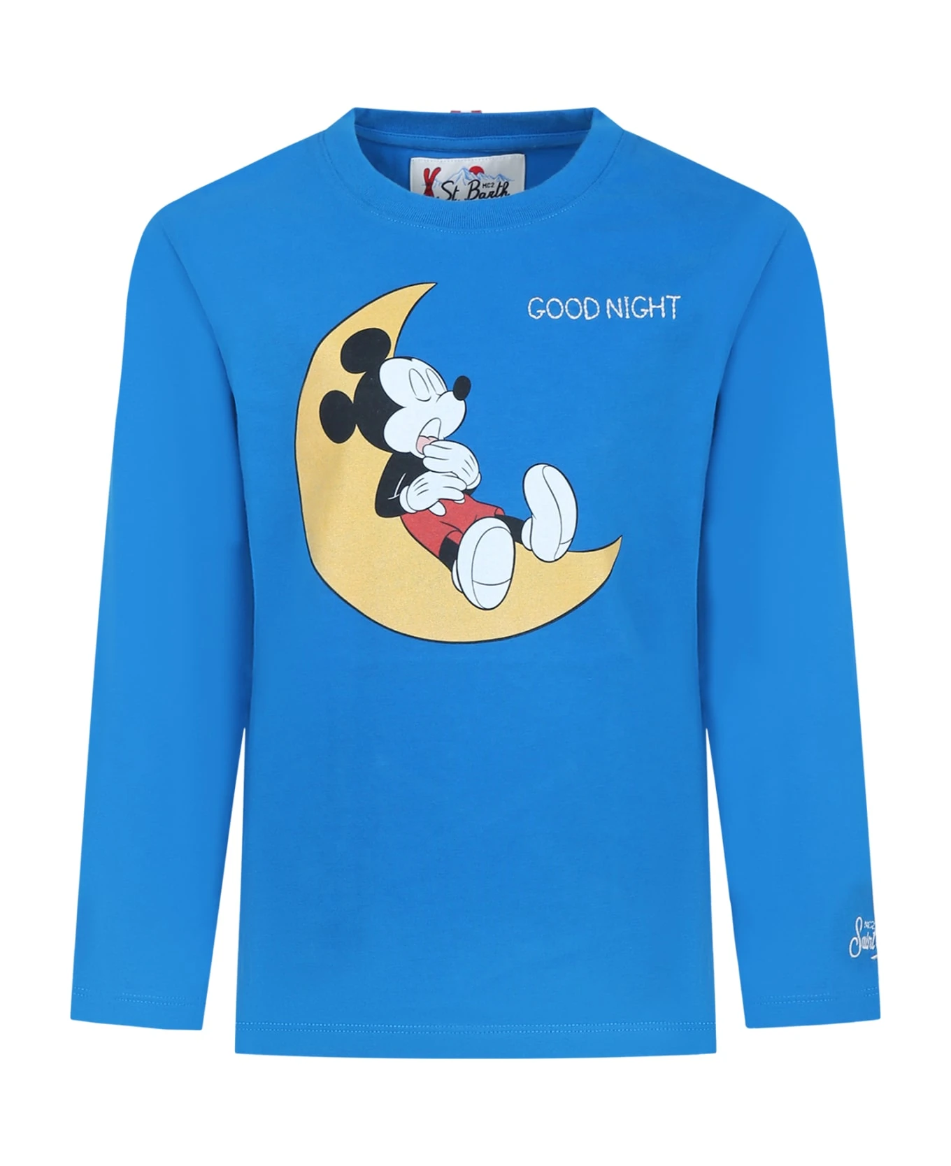 Blue pajamas t-shirt in cotton, long sleeve, ribbed crewneck; in size 2 years it has a button closure on the shoulder. It is embellished with mickey mouse print, white embroidery on the front, logo embroidery on the sleeve.