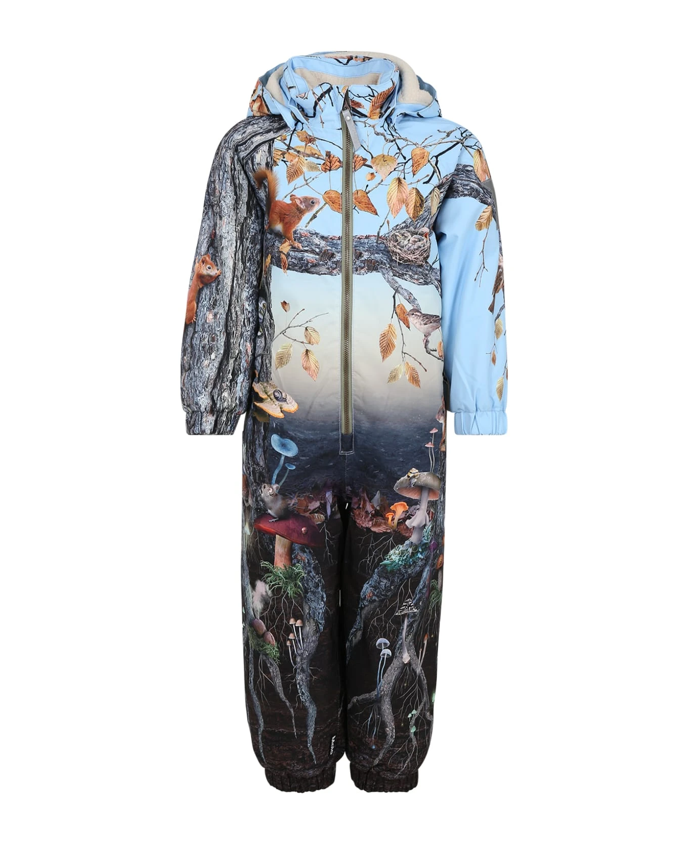 Light blue, padded and waterproof snow suit, shearling lining, with removable hood, front zip closure, side pockets with zip, elasticated cuffs and ankles, fastening bands. It is embellished with all-over forest print and star on the sleeve; made from recycled polyester.