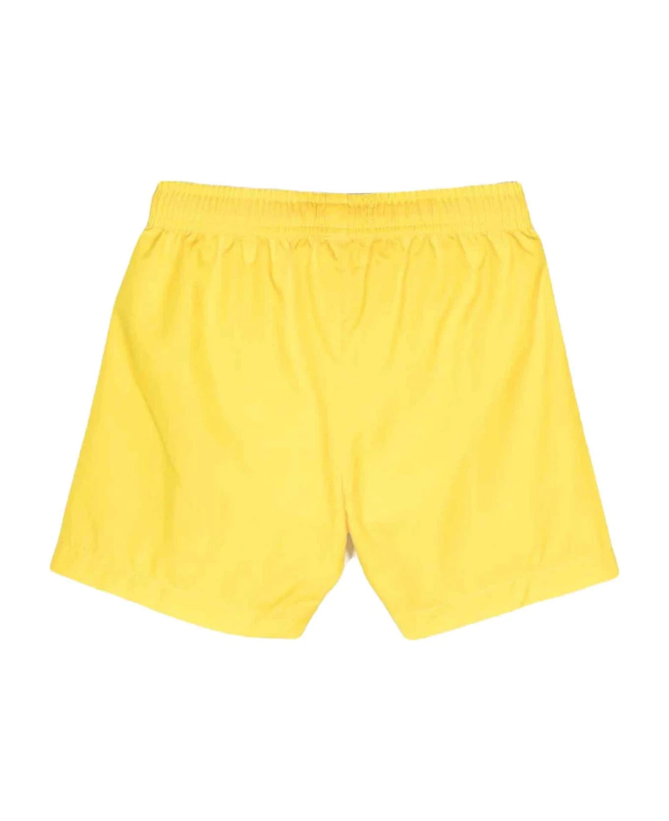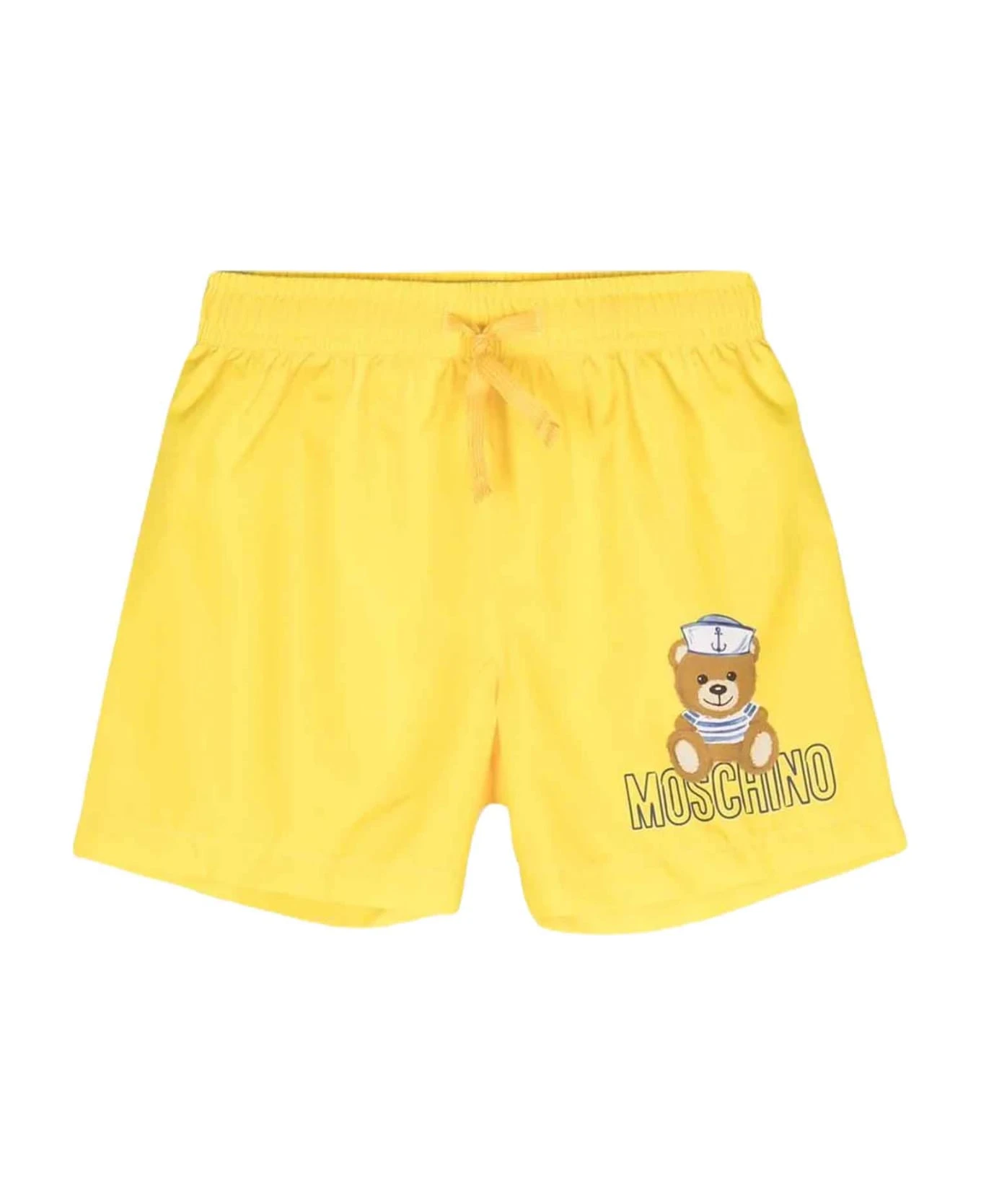 yellow swimsuit boy. Teddy bear print, drawstring waist and wide leg fit. 100% polyester