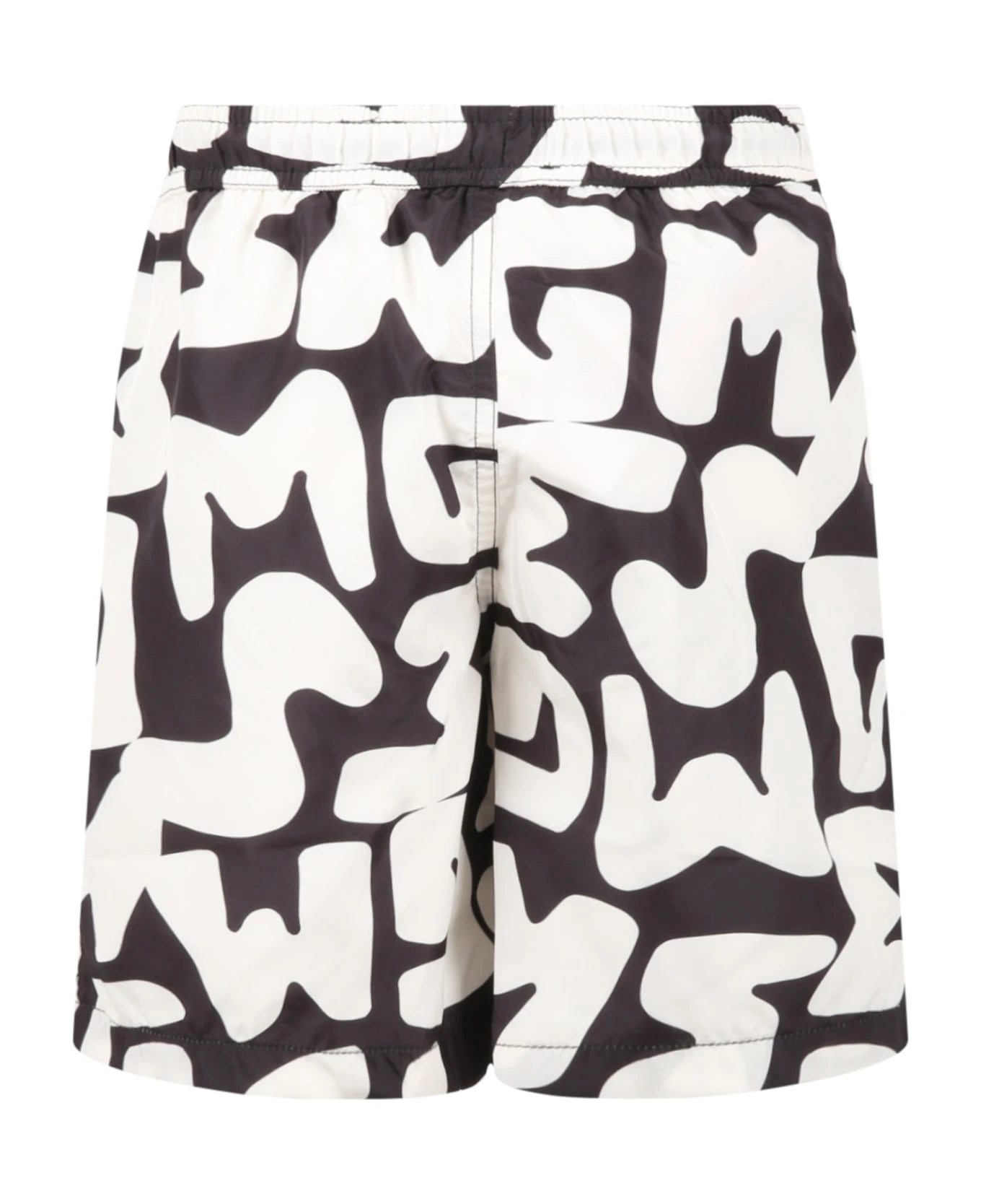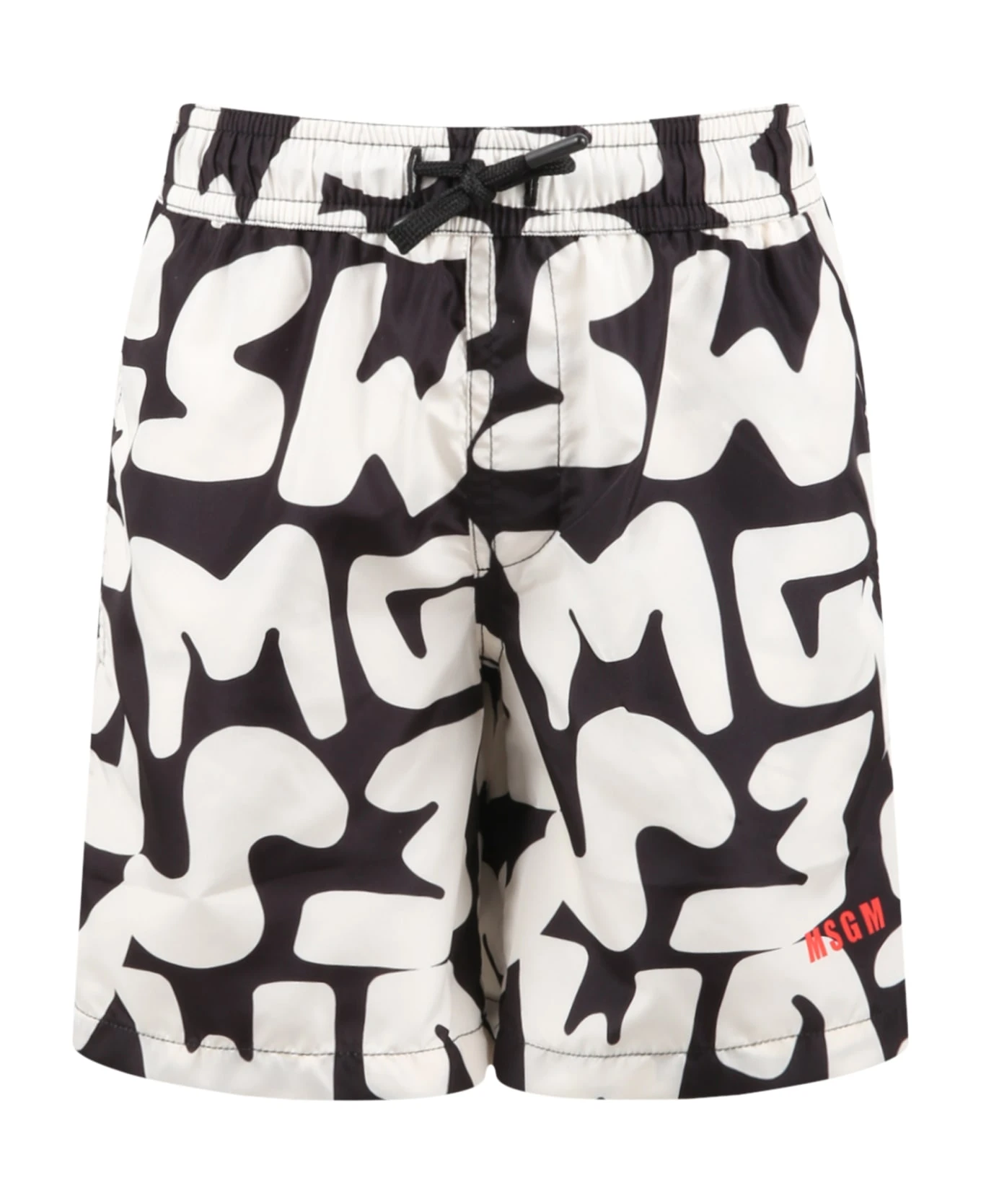 Black swim trunks with elasticated waist with drawstring and side pockets. They are embellished with all-over ivory logo and red logo on the front.