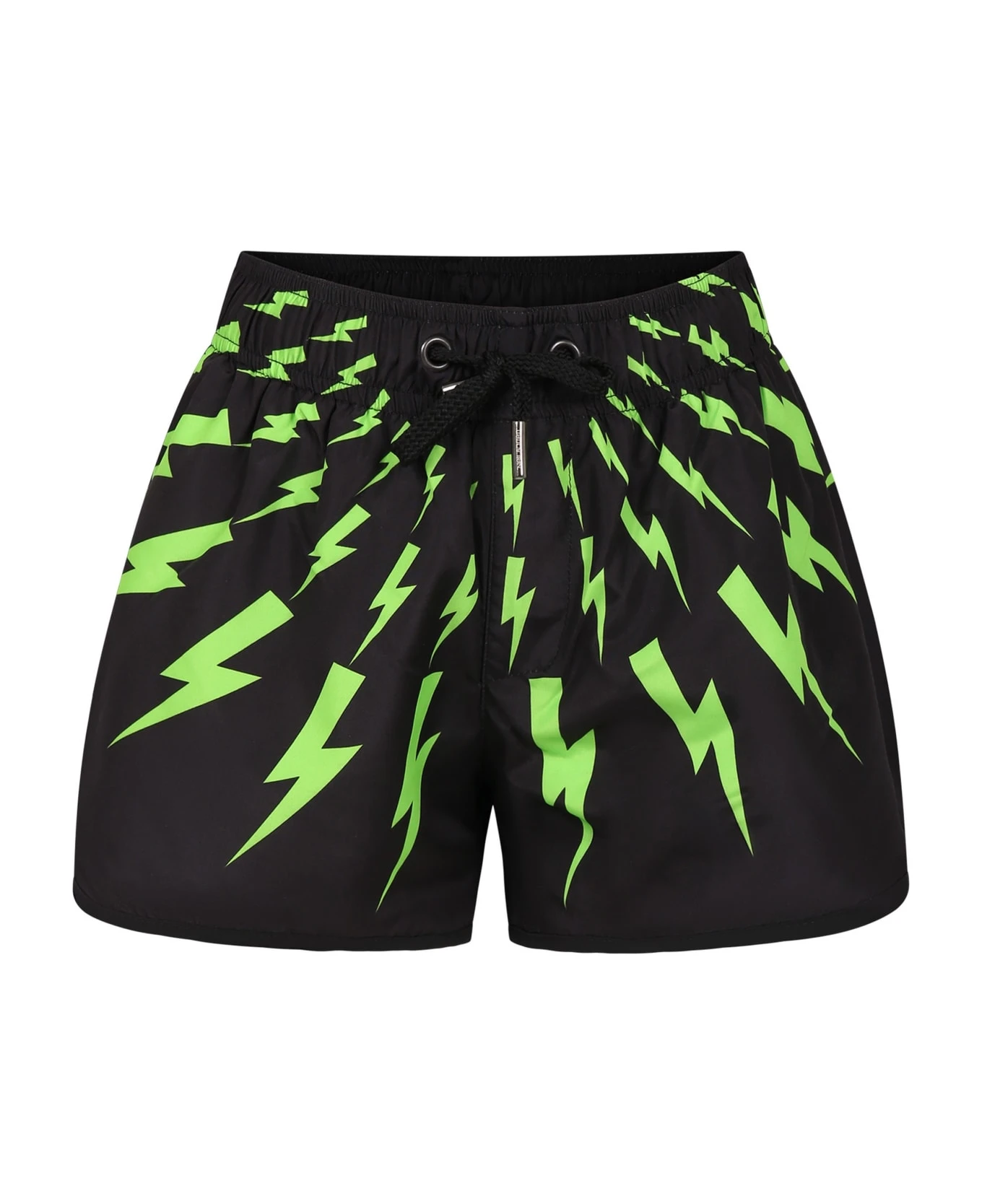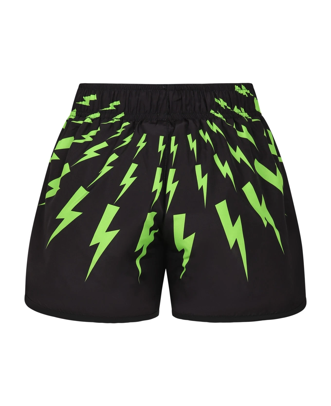 Black swim boxer, with elastic waist and drawstring. It is embellished with iconic green lightning bolts on top.