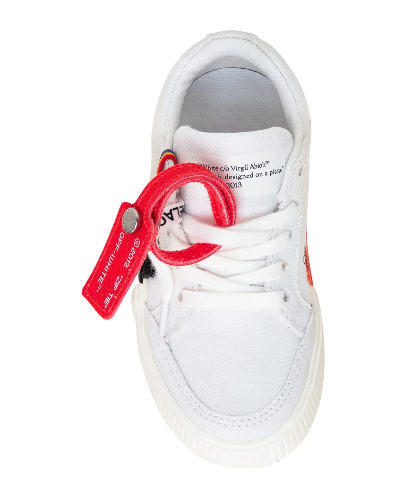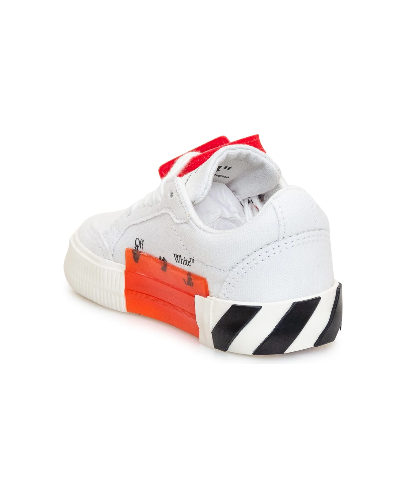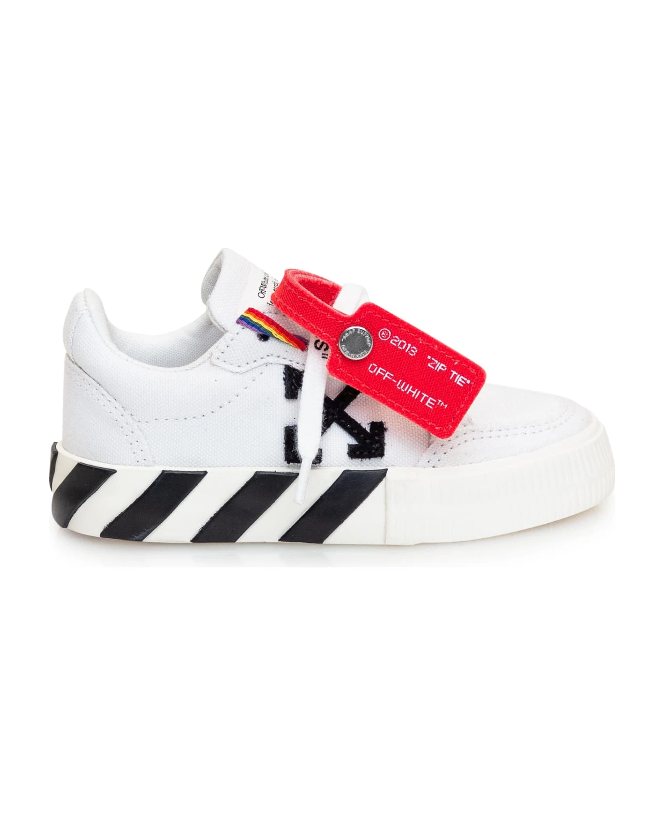 Low white sneaker. Lace-up closure. Arrow patch on the side. Logo printed on the side.