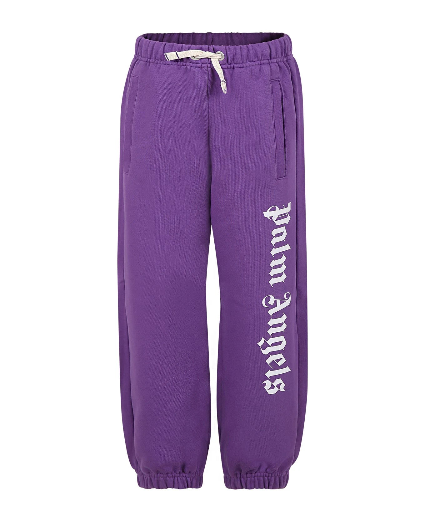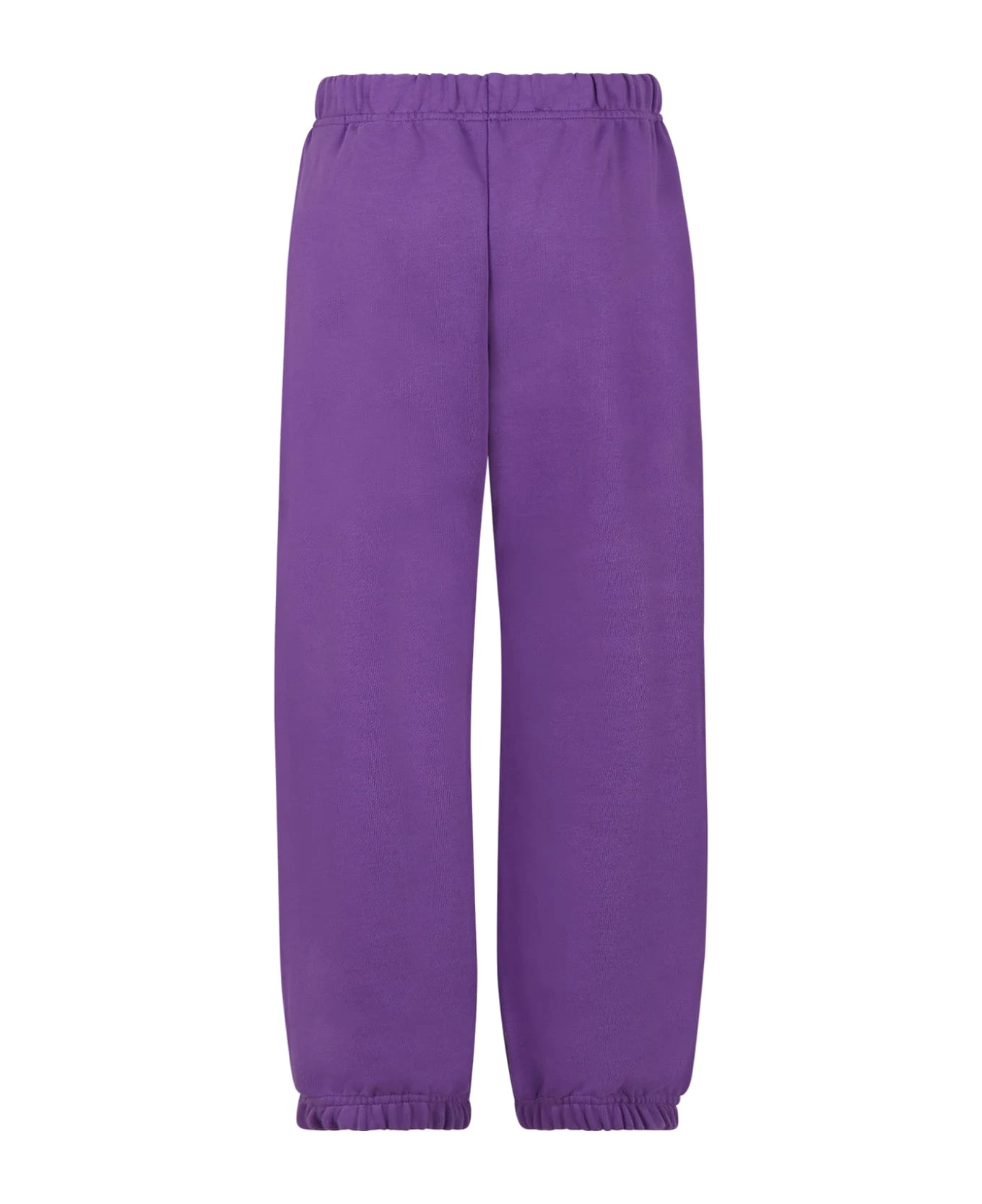 Purple trousers in brushed cotton, with elastic waist. drawstring, side pockets and ribbed ankles. They are embellished with white logo on the leg.