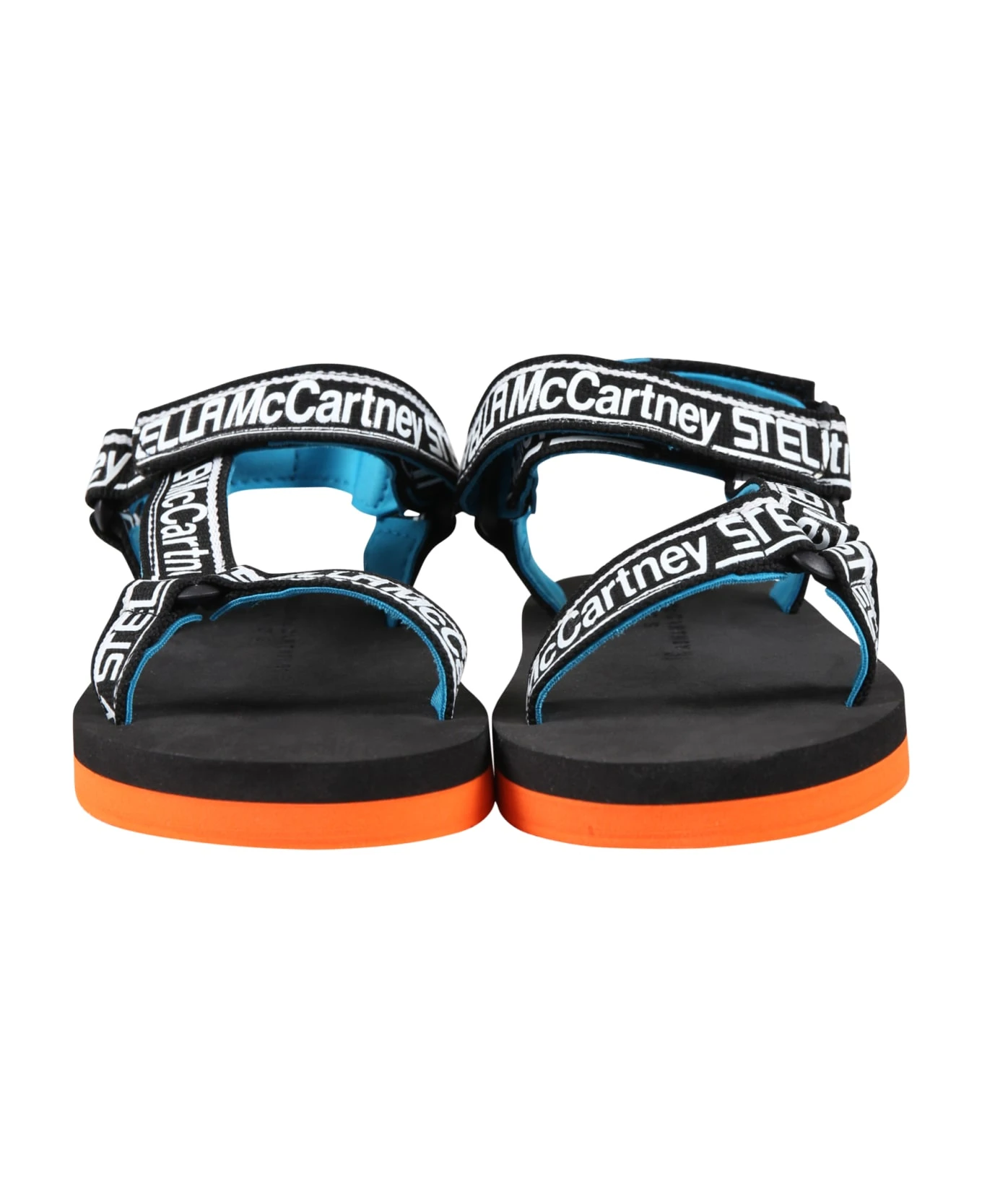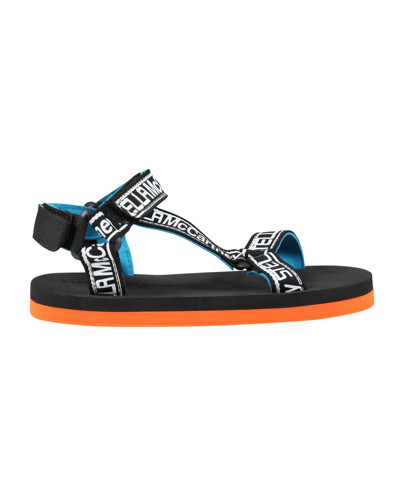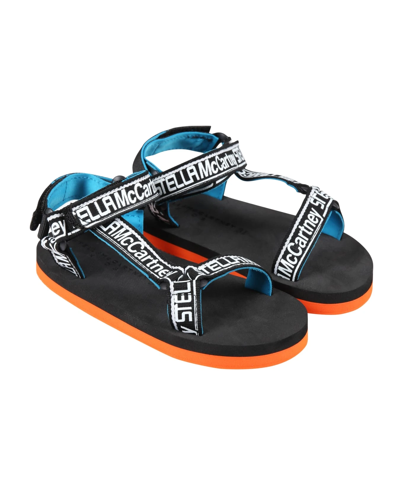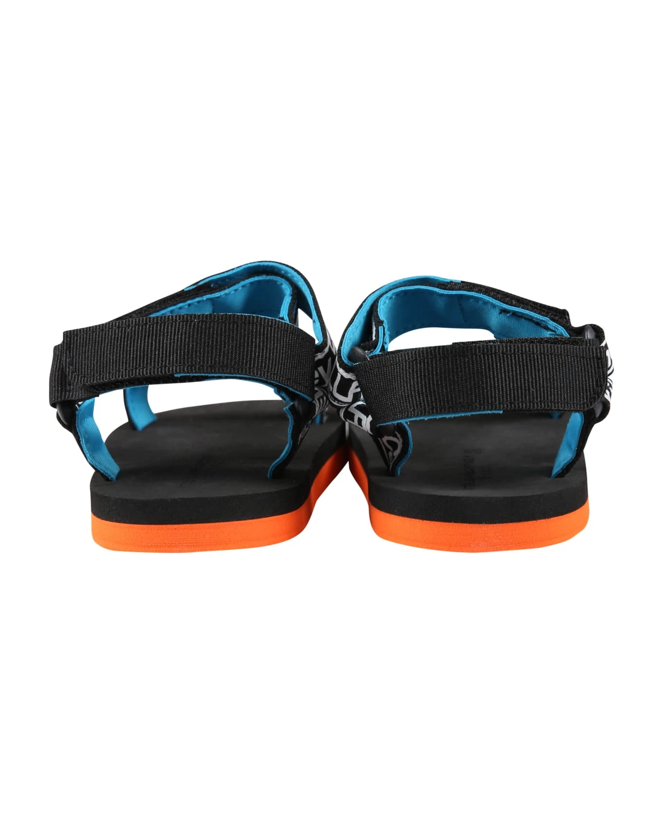 Black sandals, with orange rubber sole, black bands, velcro closure on the top and back. They are embellished with all-over logo on the top.
