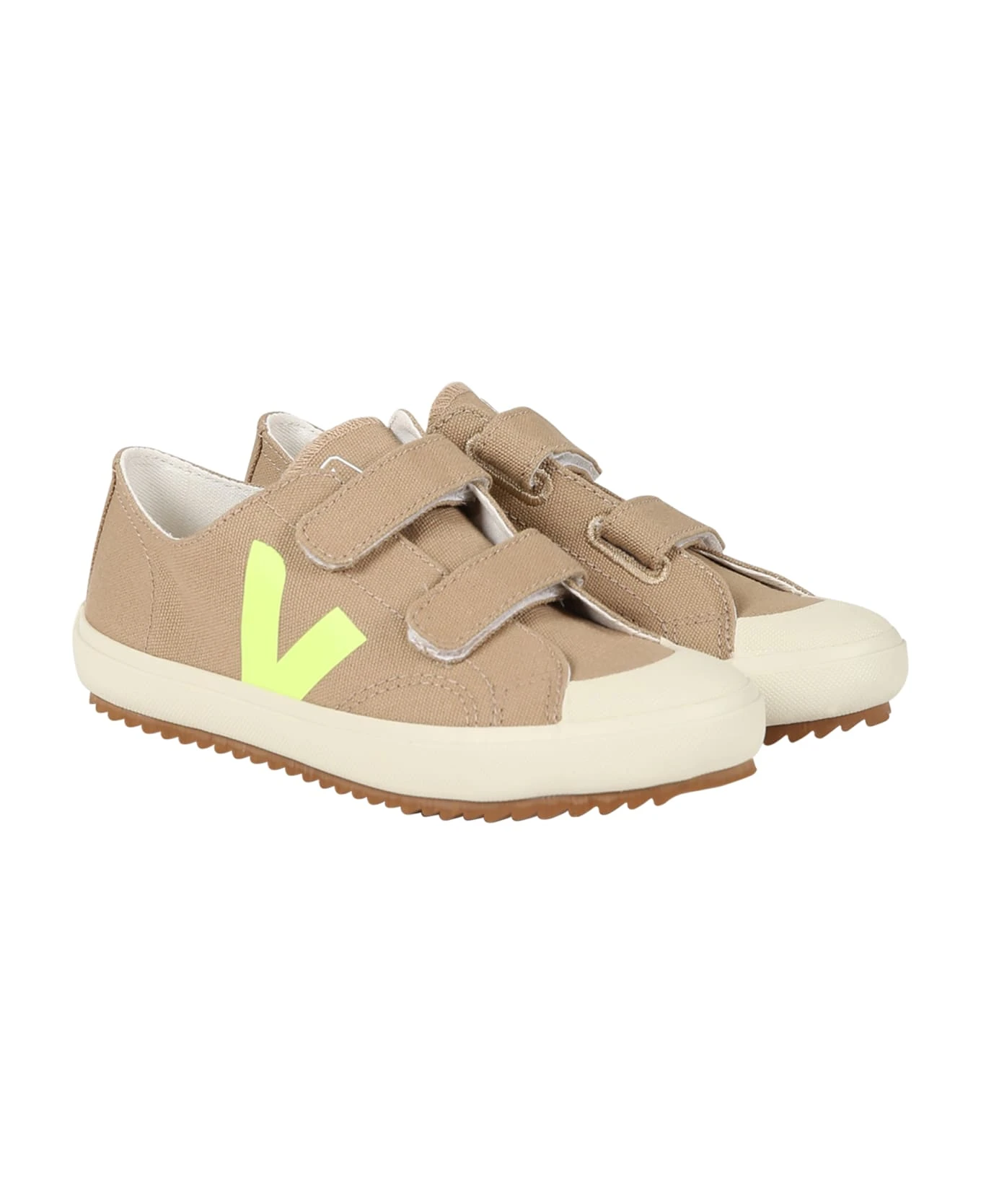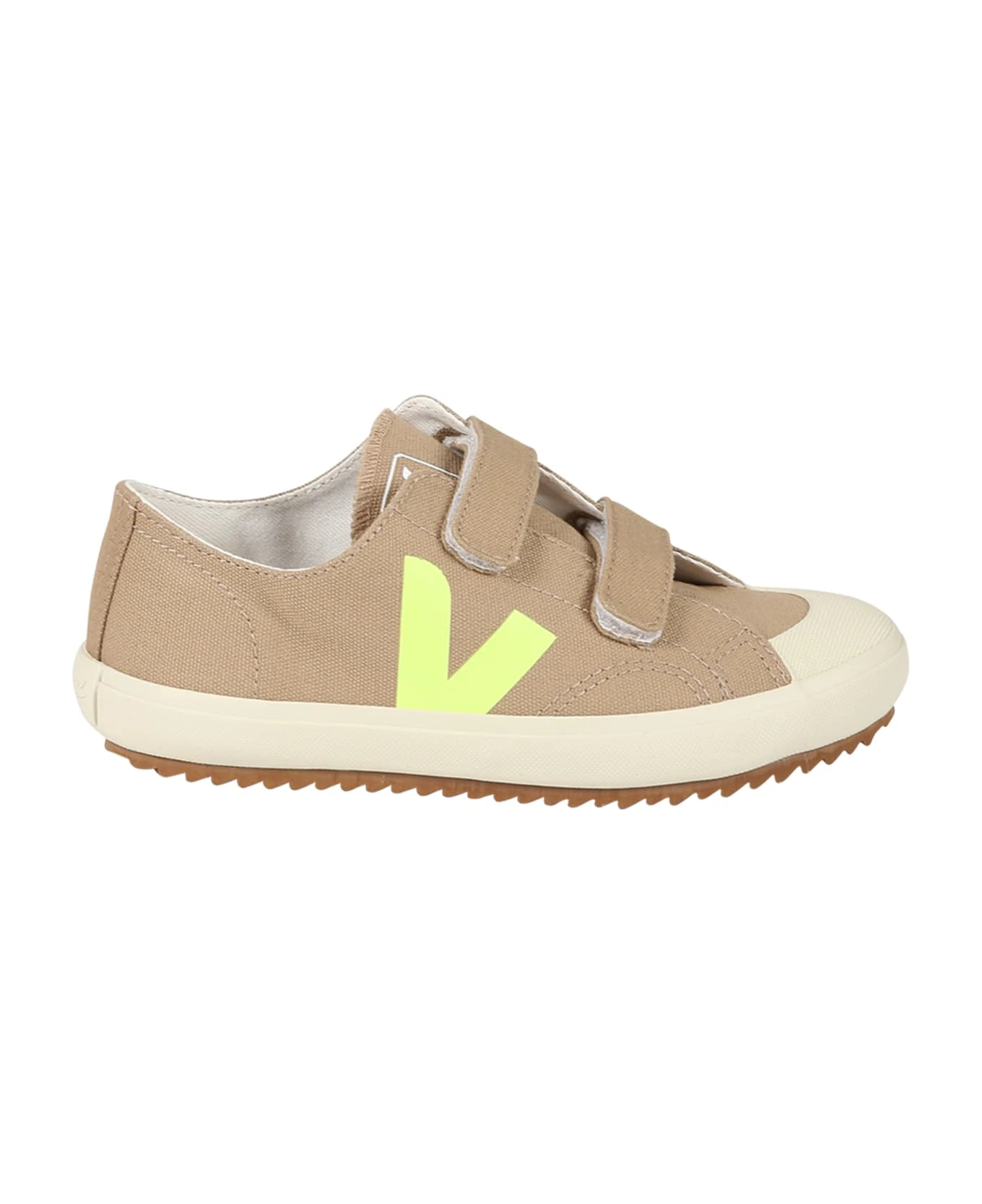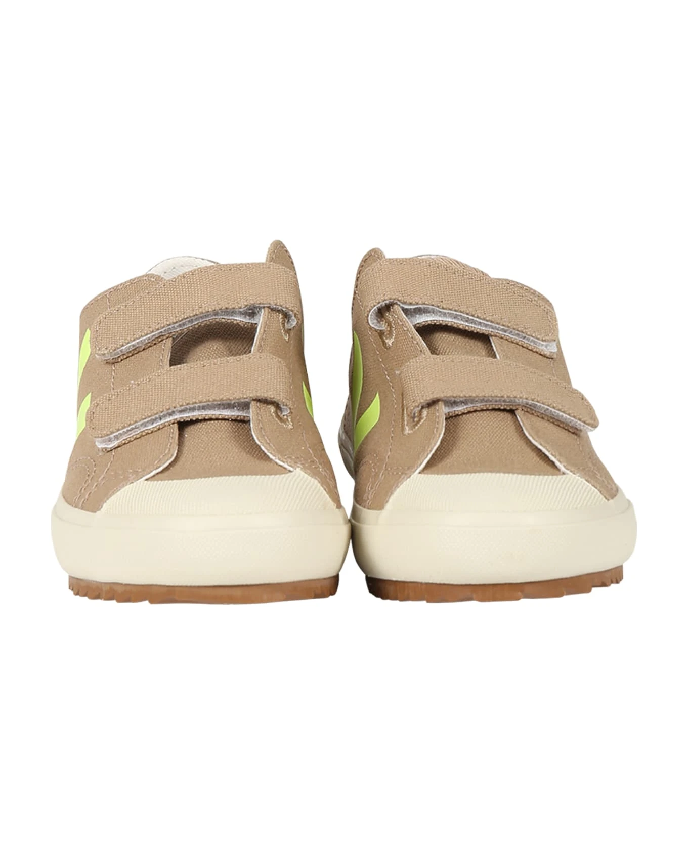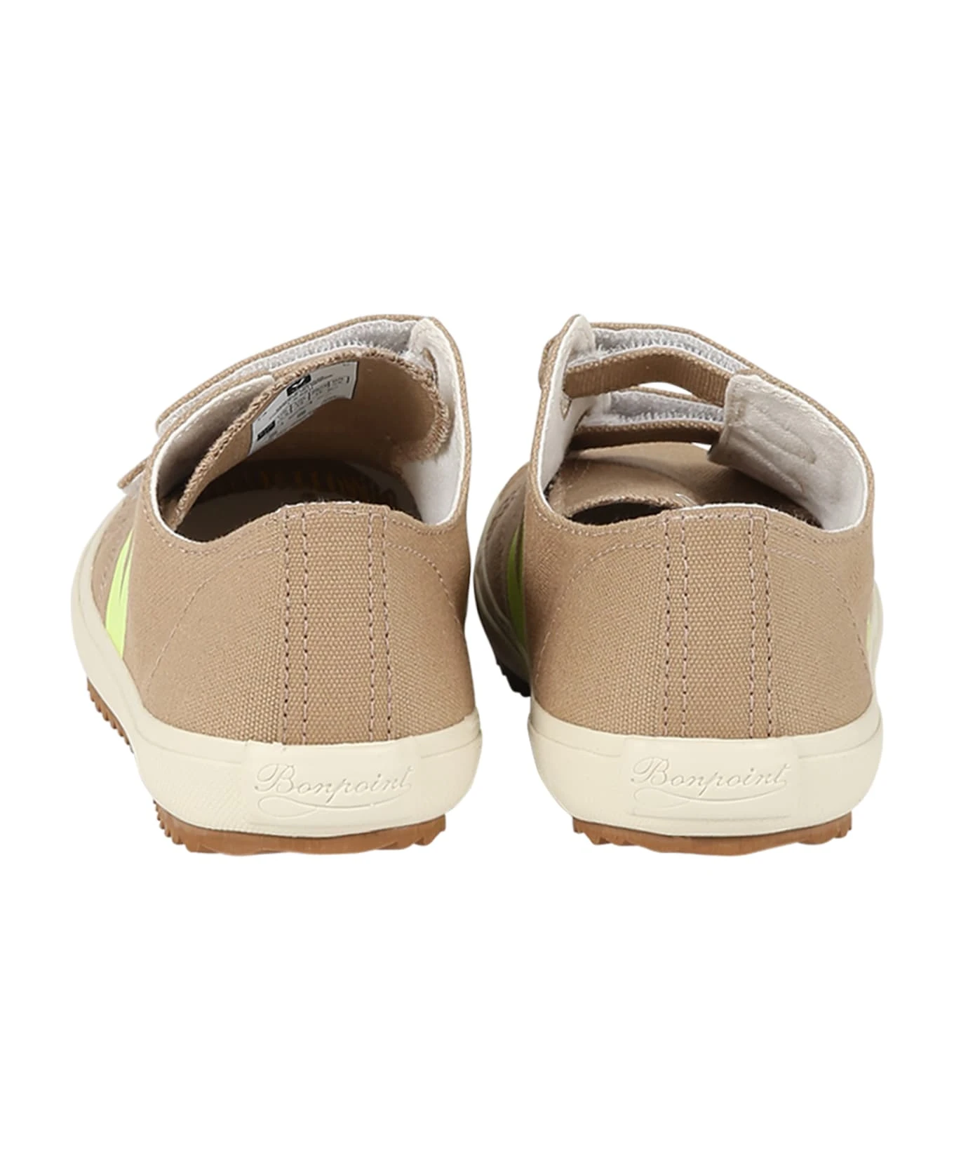 Brown sneakers, in canvas, rubber sole, round toe, velcro closure on the upper part. They are embellished with yellow logo print on the sides, with “Bonpoint” writing on the back. They are made by Veja x Bonpoint, with ecological and vegan materials.