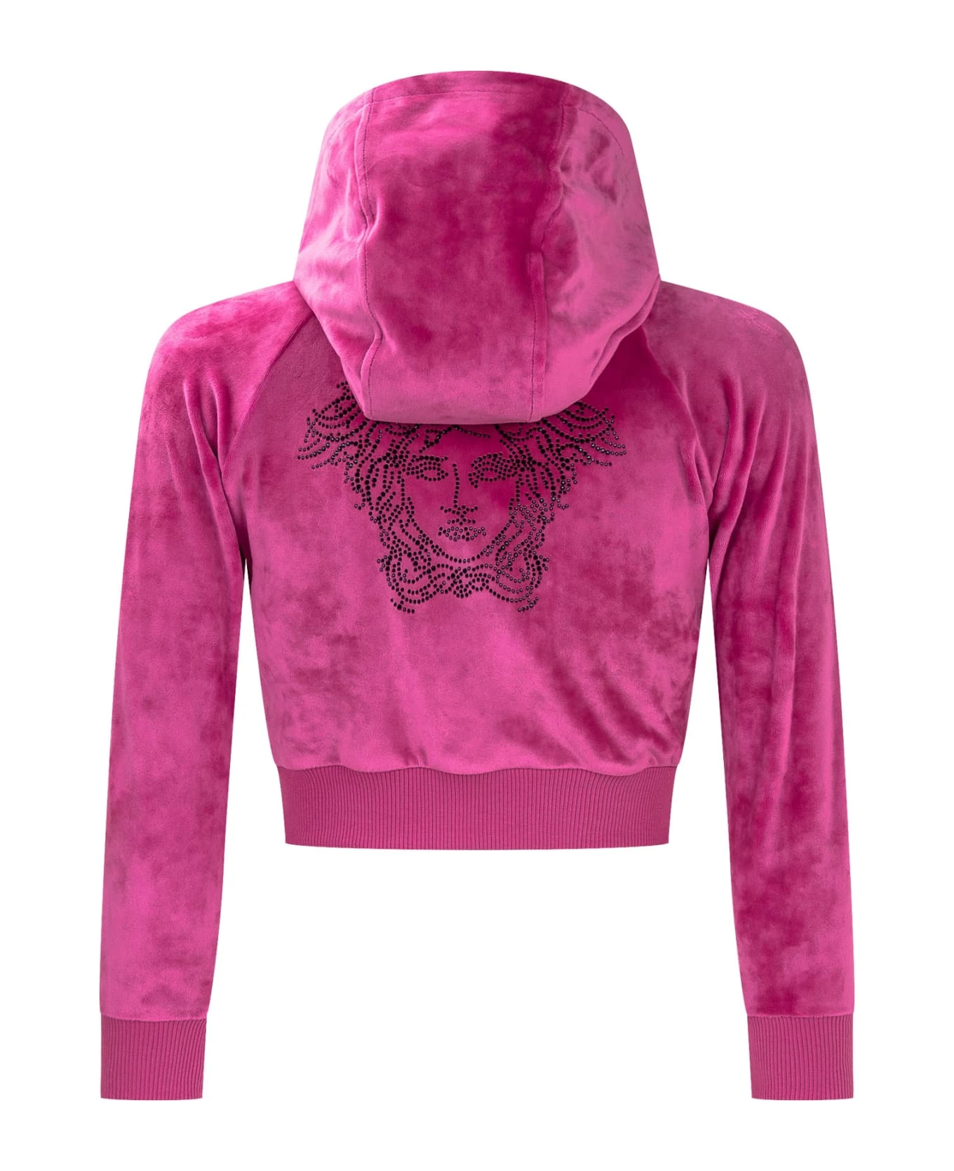 Fuchsia sweatshirt with long sleeves. Hood. Logo with rhinestones on the chest and back. Side pockets. Ribbed cuffs and bottom. Zip clousure.