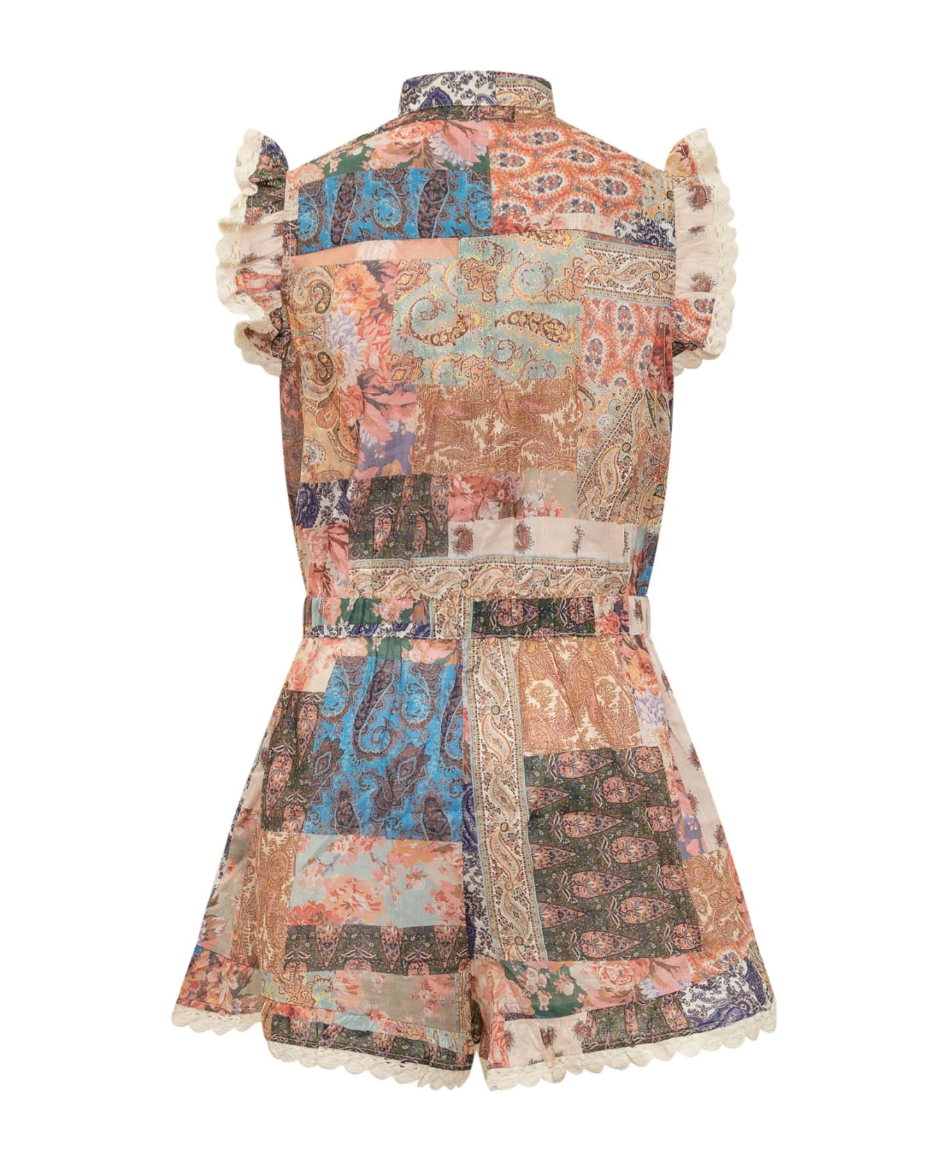 Short suit. Short sleeves. Front button closure. Waist belt. Hems with lace. Bandana print.